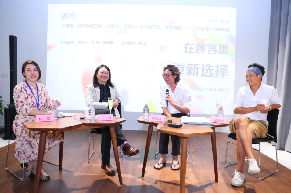 时近中秋,由于疫情影响而久未谋面的“迷宫”展览团队,终于在馆内实现了“团圆”。联合策展人、作家许知远,对话展品提供者、艺术家手作书收藏者王骥,王骥好友、《书之极》出品人张向东,金桥碧云美术馆馆长林薇,讲述展览与艺术家手作书背后的故事。