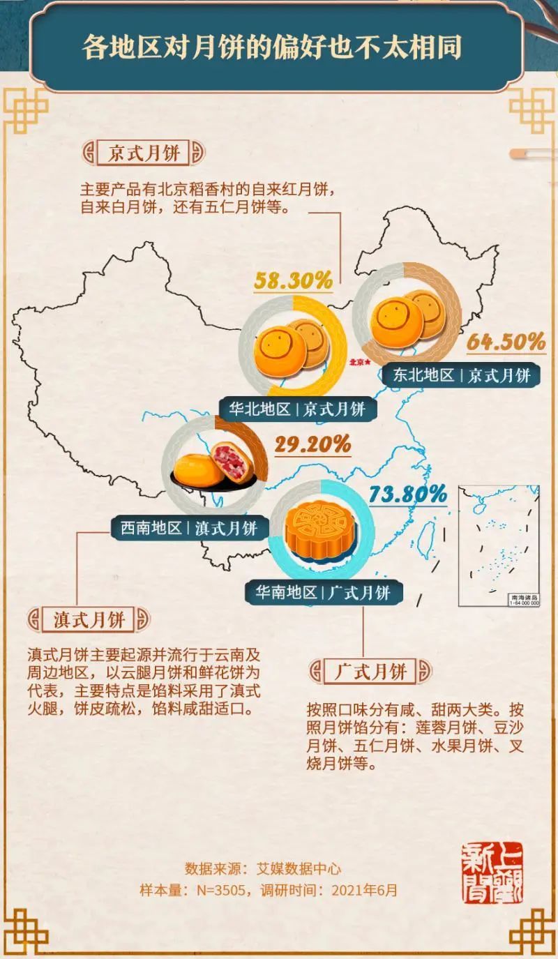 常见的月饼,有“广式”、“京式”、“苏式”、“港式”和“滇式”。华南地区喜爱广式月饼;华北地区与东北地区消费者往往喜爱京式月饼;而以云腿月饼和鲜花月饼为主的滇式月饼,在西南地区占有一片“天地”。