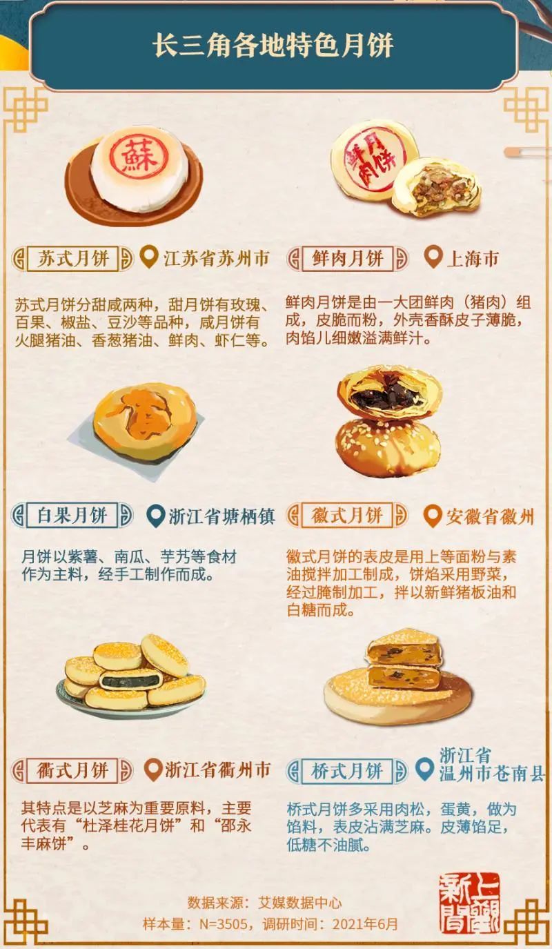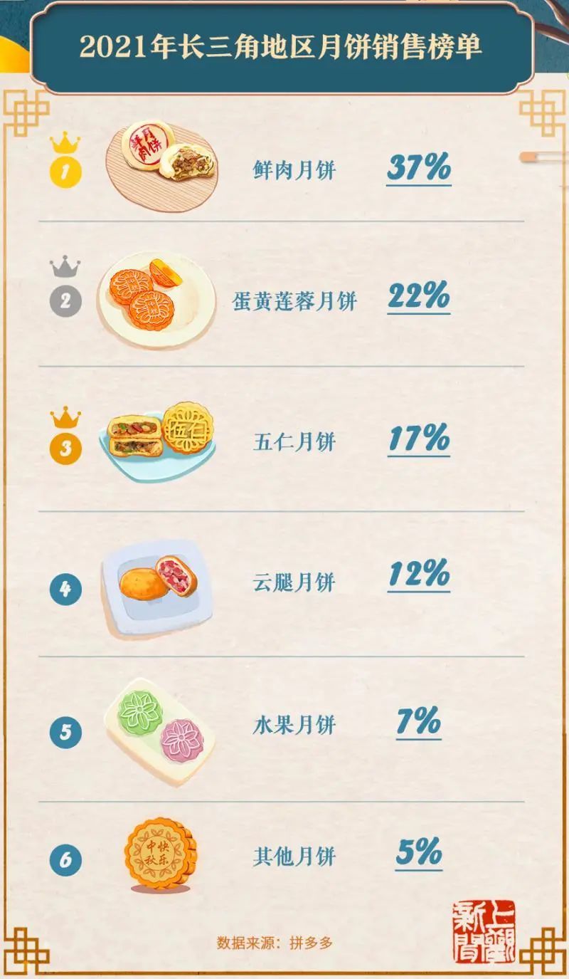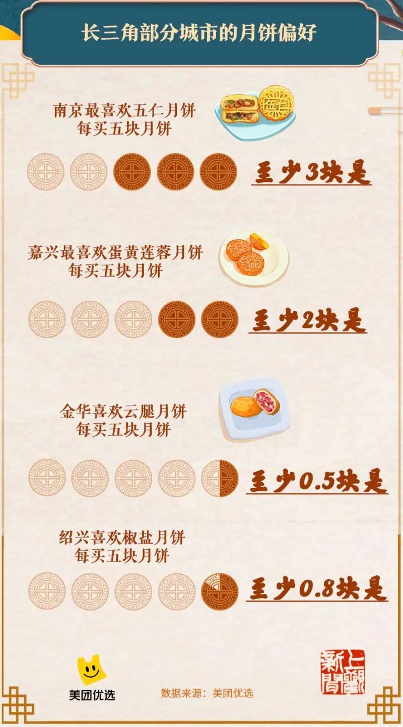 根据美团优选的数据,长三角各个城市对于月饼的喜好也不相同。南京市民最爱的是五仁月饼,嘉兴市民偏爱蛋黄莲蓉月饼,金华一带云腿月饼热销,而绍兴人民则青睐椒盐月饼……