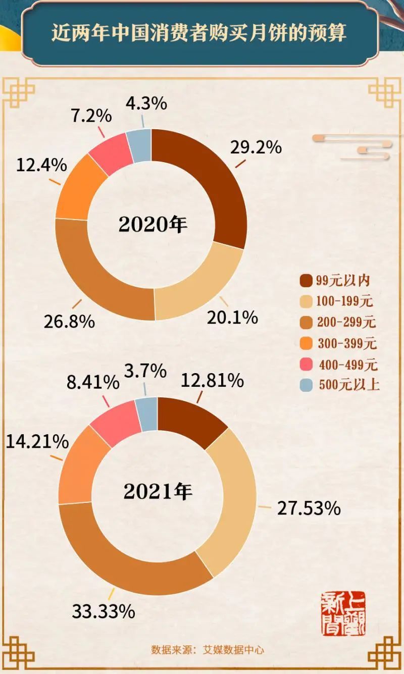 此外,国人对于月饼消费的预算也有所提高。今年近60%的消费者愿意花100至300元购买月饼,相比去年,预算在100至199元的占比提高了7.4%,预算在200-299元的占比也提高了6.5%。