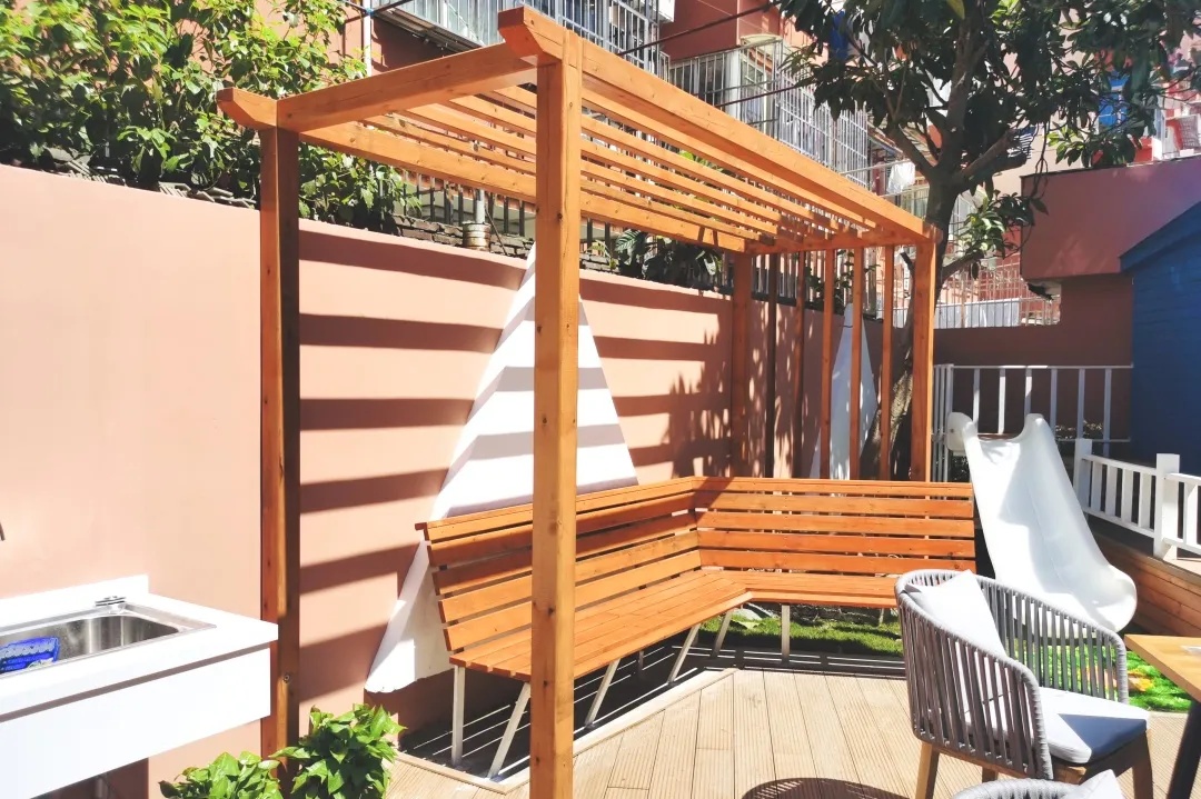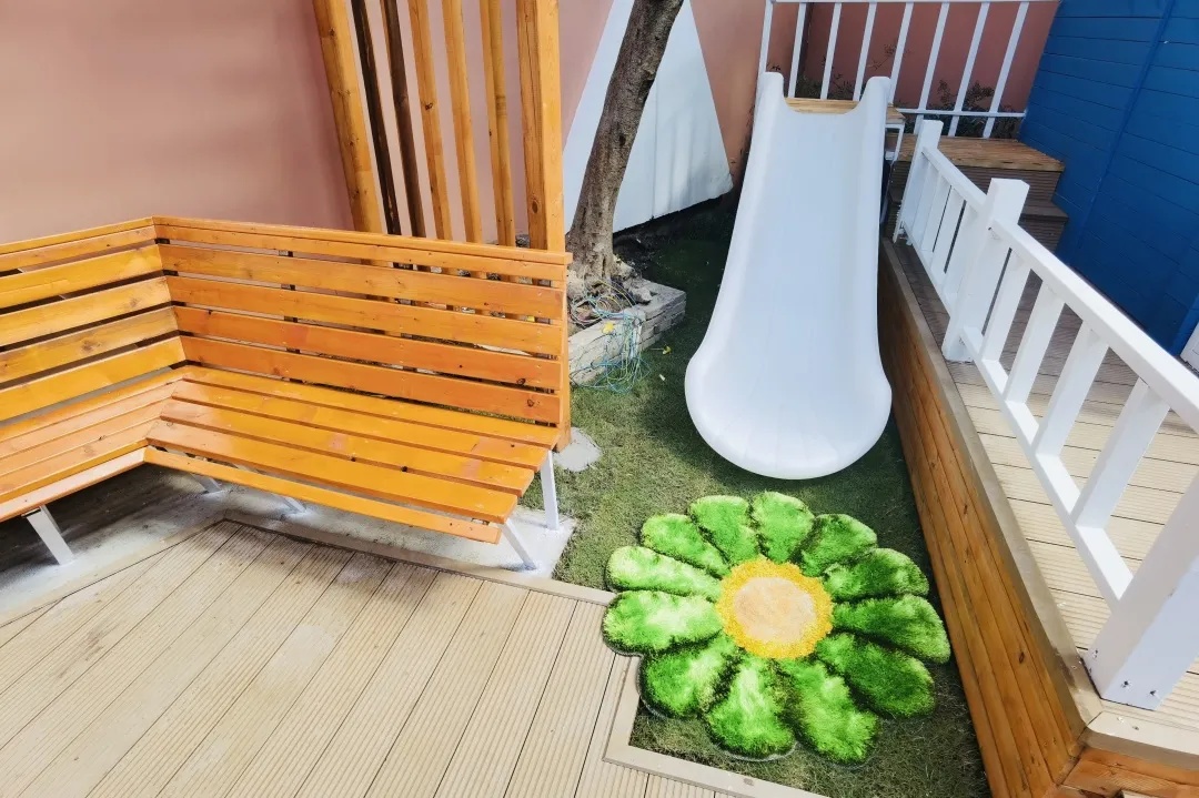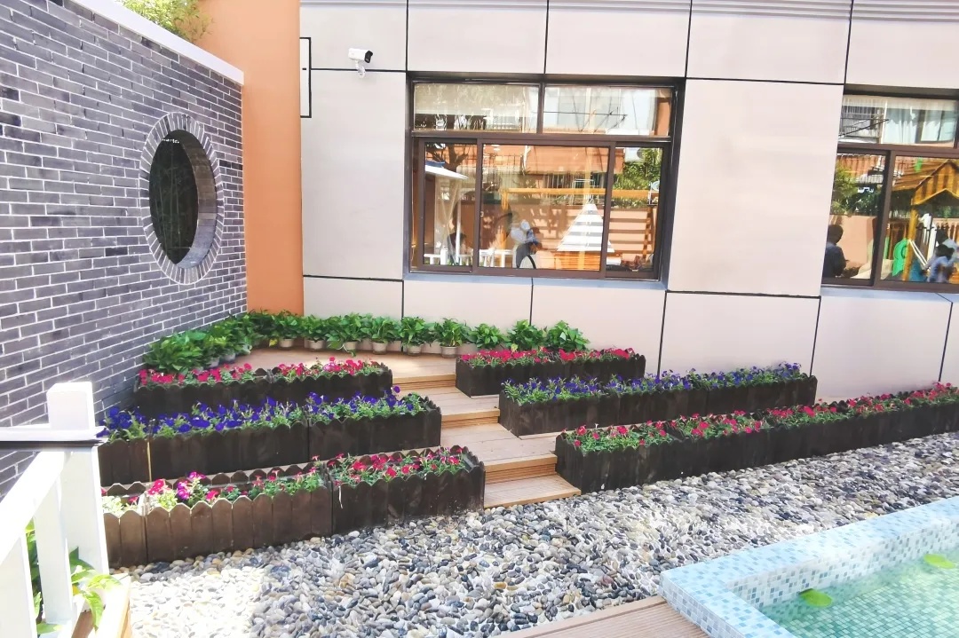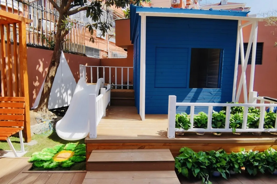 除了提供就餐服务外,室外还有一个营养花园,设有营养欢乐屋、滑梯、休闲椅、蔬菜种植区等。