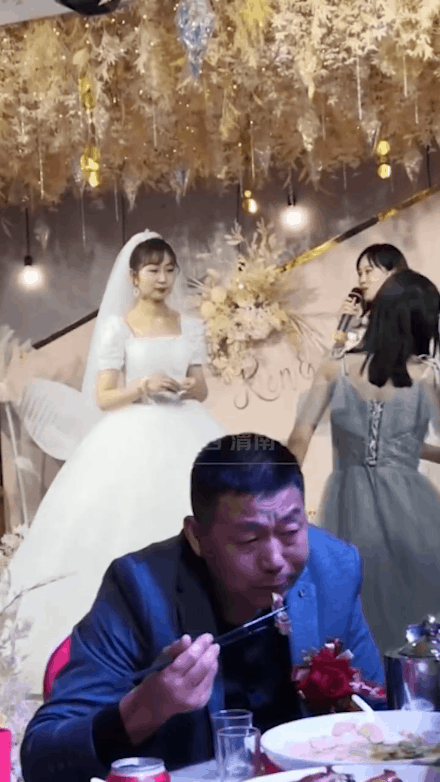 女儿结婚父亲台下边吃东西边抹泪