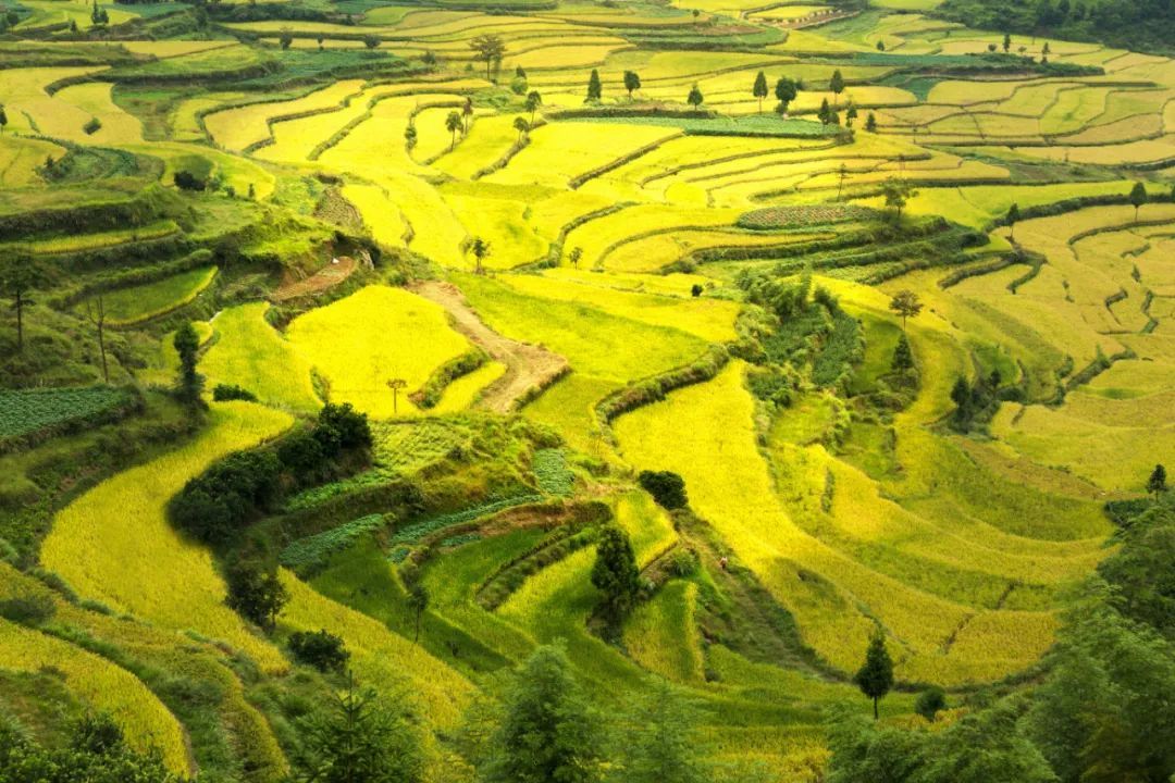 茗岙梯田依偎在楠溪江畔,藏身于海拔800多米的高山之中,是除了云南元阳梯田外江南最大的梯田。作为江南地区最大的梯田之一,茗岙梯田历经了先民们一千多年的耕作开凿,才形成了如今的壮观场面。金秋,正是稻叶飘香的时候,层层梯田纵横交错,稻浪滚滚,站在高处向下看,梯田呈不规则的月牙状,一片沉甸甸的金黄,为大地披上柔软厚实的绒毯,周旁时有绿树点缀,阡陌相连,房屋分散其中,展现出一片自然淳朴的乡村生活风情。