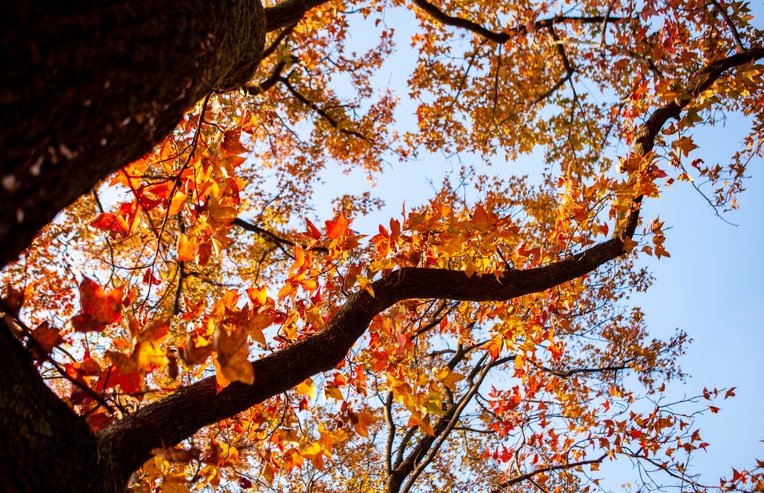 徒步赏红枫,不知不觉到了日暮之时,天边的火烧云与丹枫争艳,满山满眼都是红彤彤的颜色,模糊了地与天的界限,走在其中,仿若投身一片赤海,久久不舍得离开。