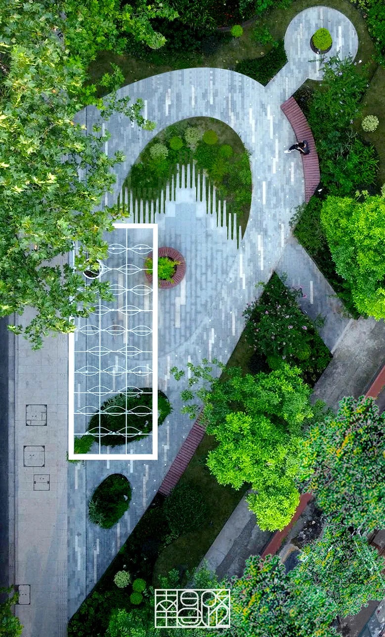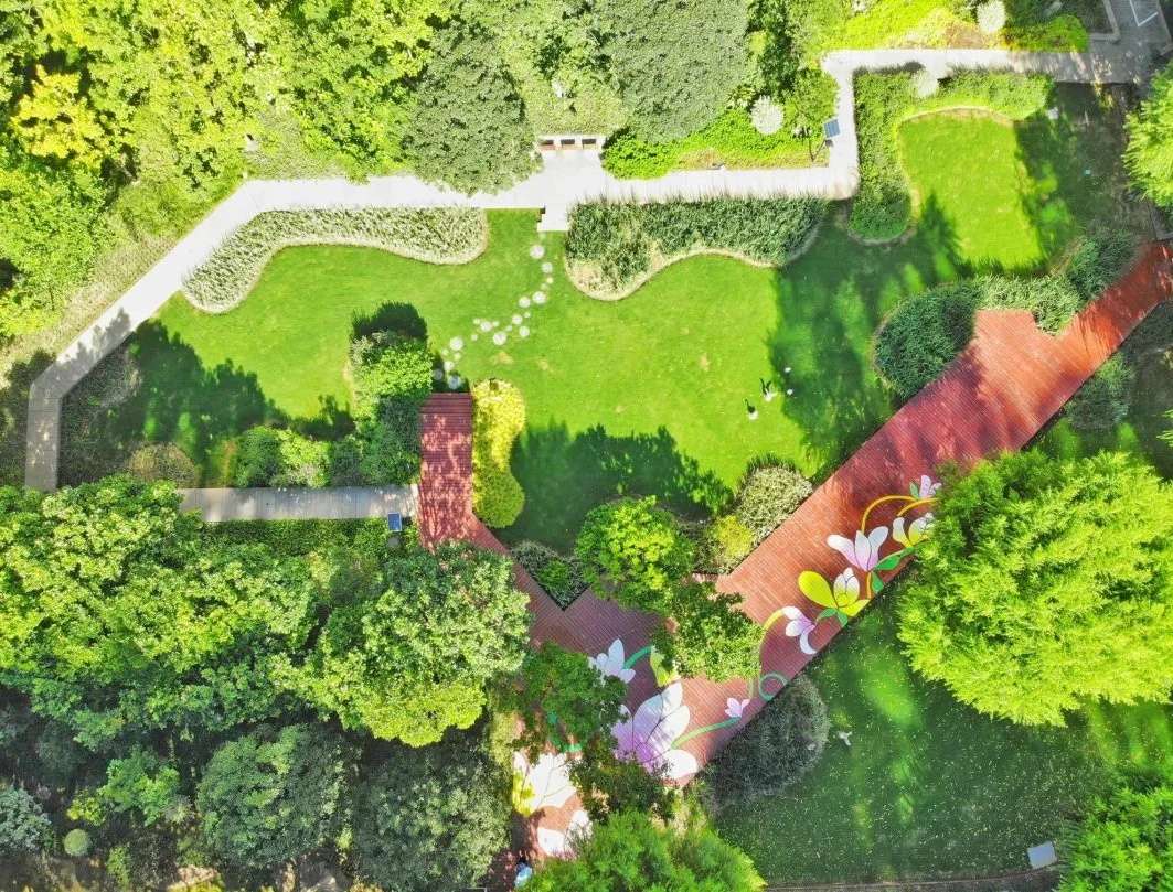 寻芳园中央设置特色花香亭,并且保留原有高大乔木,搭配花灌木、缤纷花境,局部植入特色嵌草砖;预留廊下与草坪活动空间,激发街区活力。