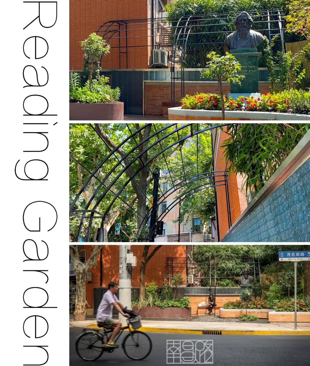 阅读花园与书店联合共建,通过汀步园路、阅读廊架、琉璃书墙,休憩空间,打造小巧而精致的阅读空间,抬高的花坛与泰戈尔雕塑相称。