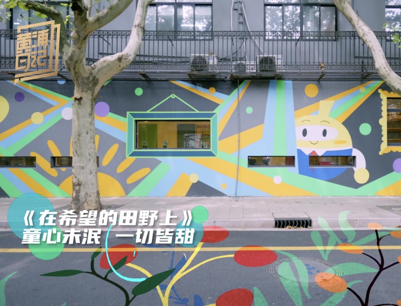 黄浦区巨鹿路第一小学外的围墙上,名叫《在希望的田野上》的墙画,用鲜艳的色彩展示童心和想象力。
