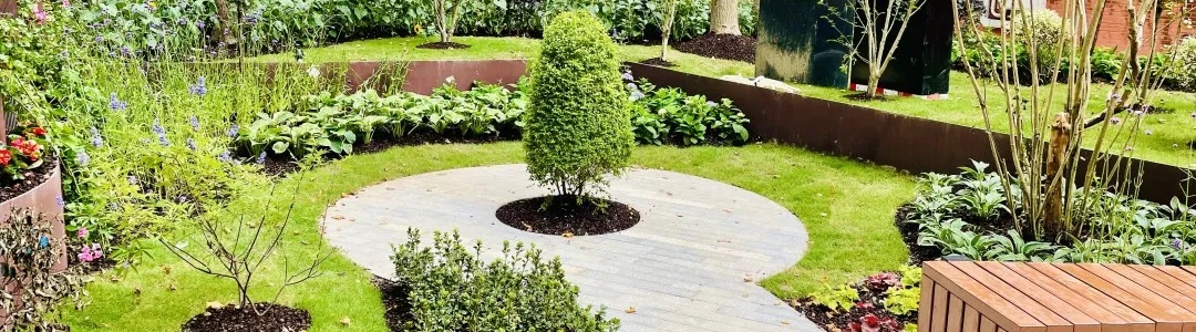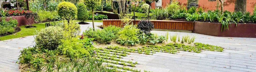 南昌路雁荡路的转角绿地拥有精致的花坛花境、细腻的表面装饰。