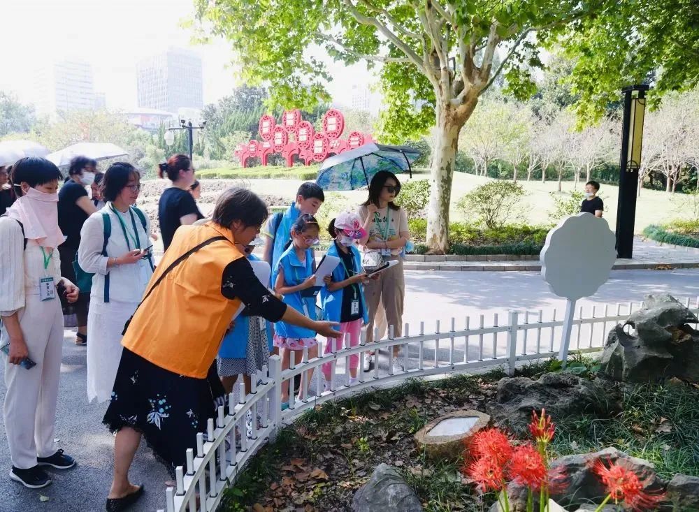 参与活动的亲子家庭跟着古树导赏老师一起从树的观赏特性(叶、果、花)认识园内的古银杏和香樟、香桃木、鸡爪槭。