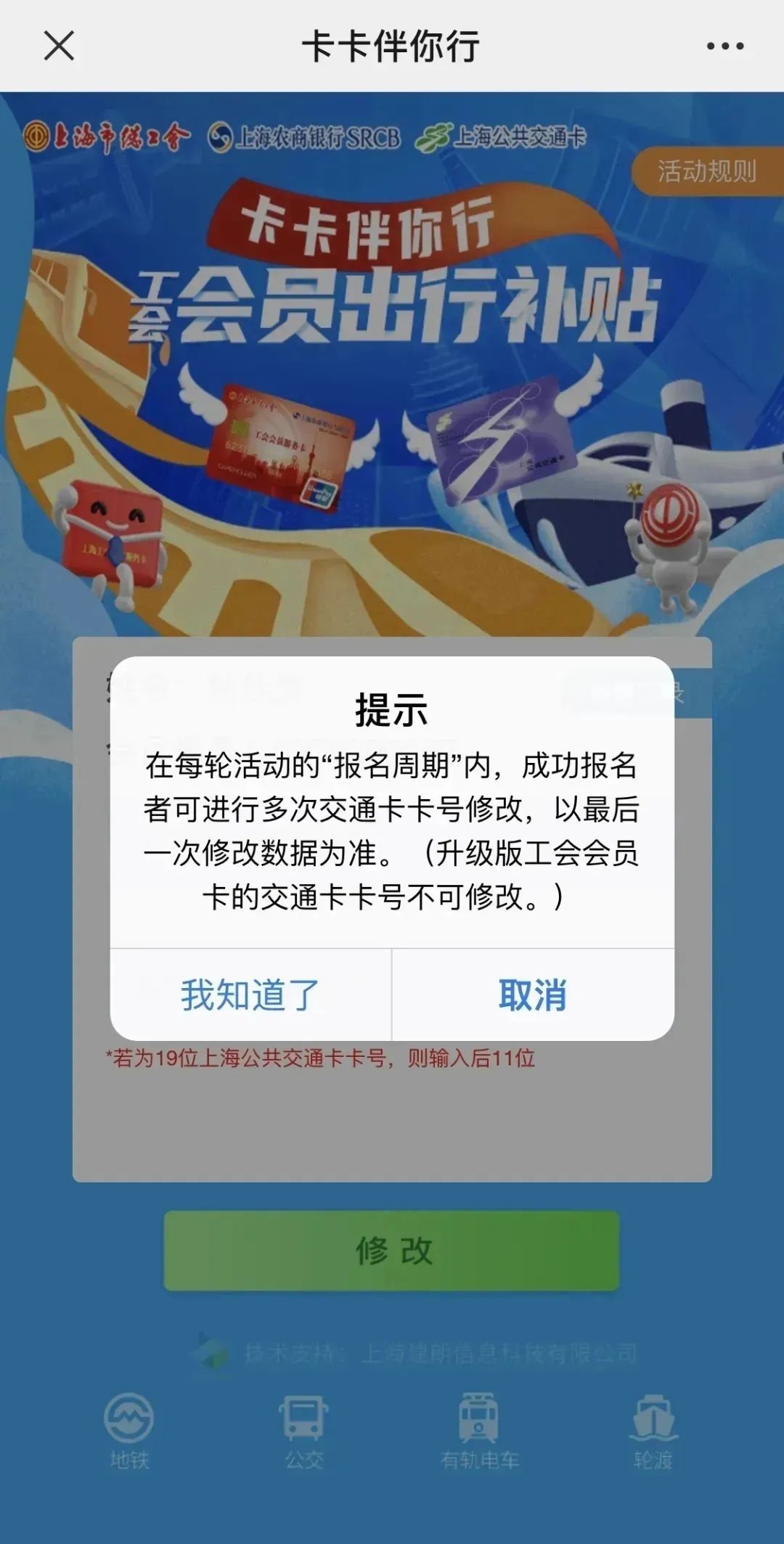 ● 在申请时间内,使用上海公共交通卡参与活动的工会会员,可多次修改绑定的上海公共交通卡卡号,但以最后一次修改数据为准;使用升级版工会会员服务卡参与活动的工会会员,对应的交通卡卡号无法修改。