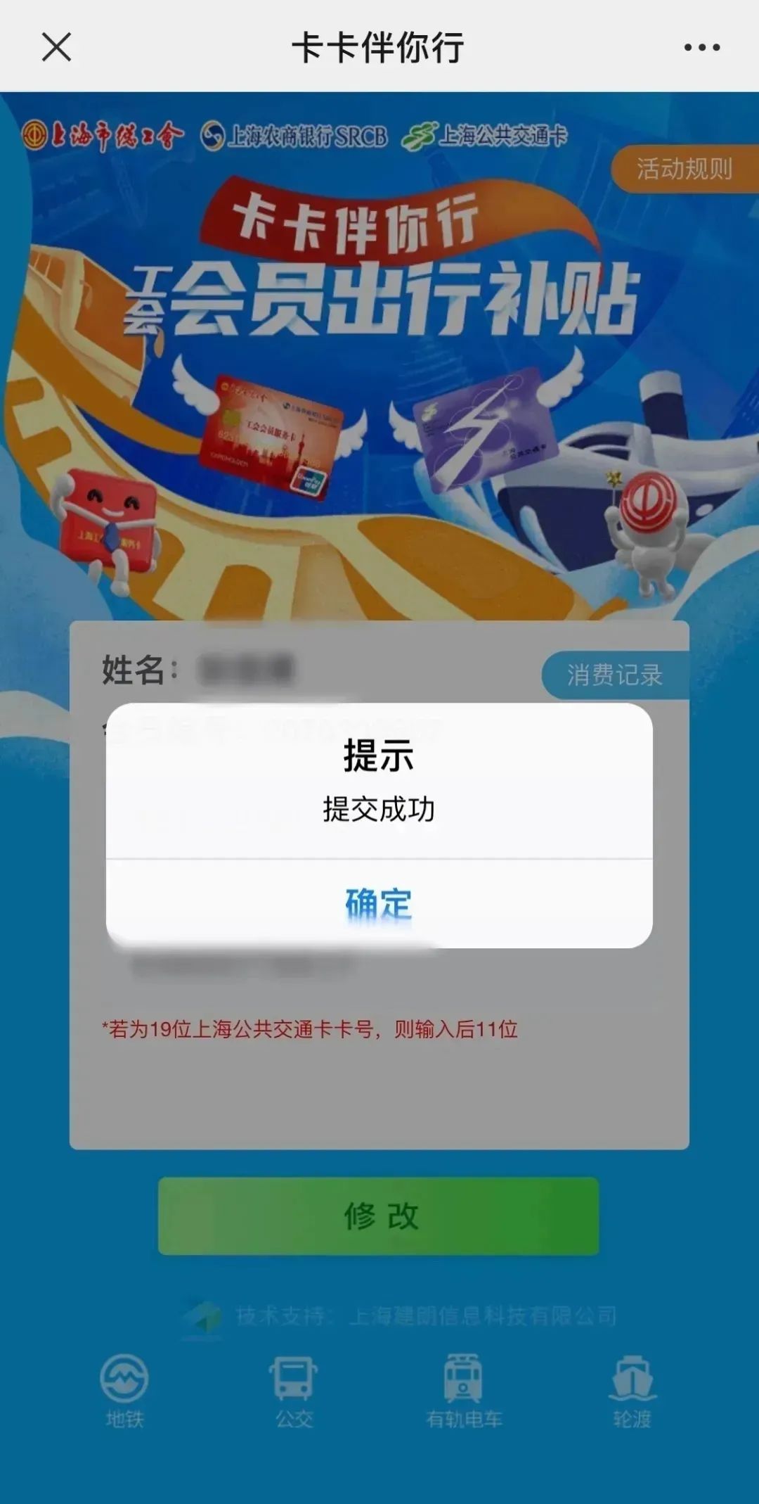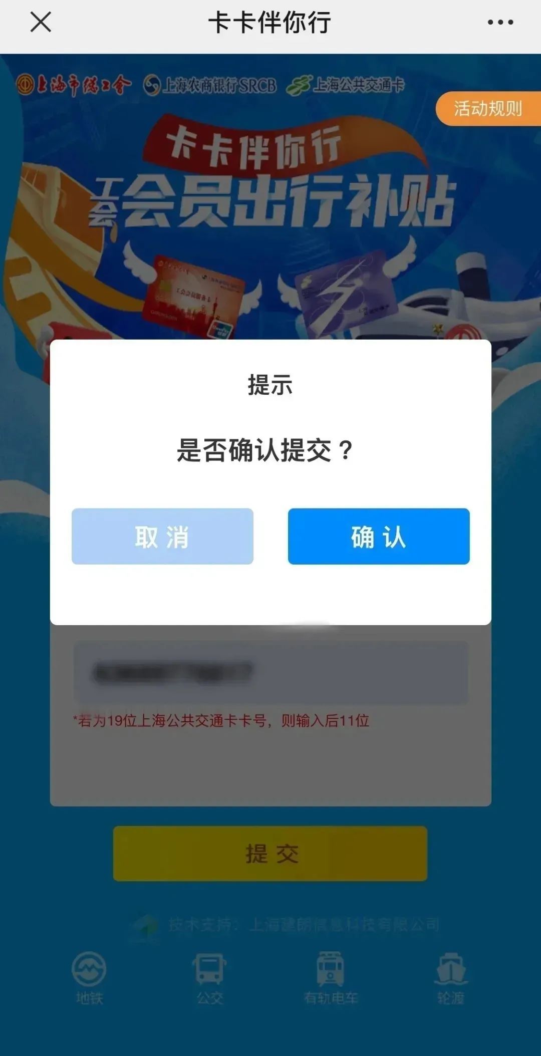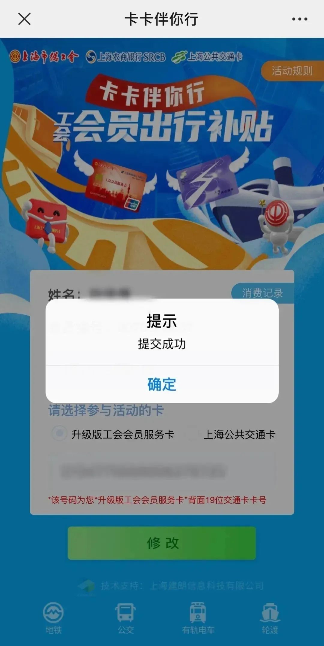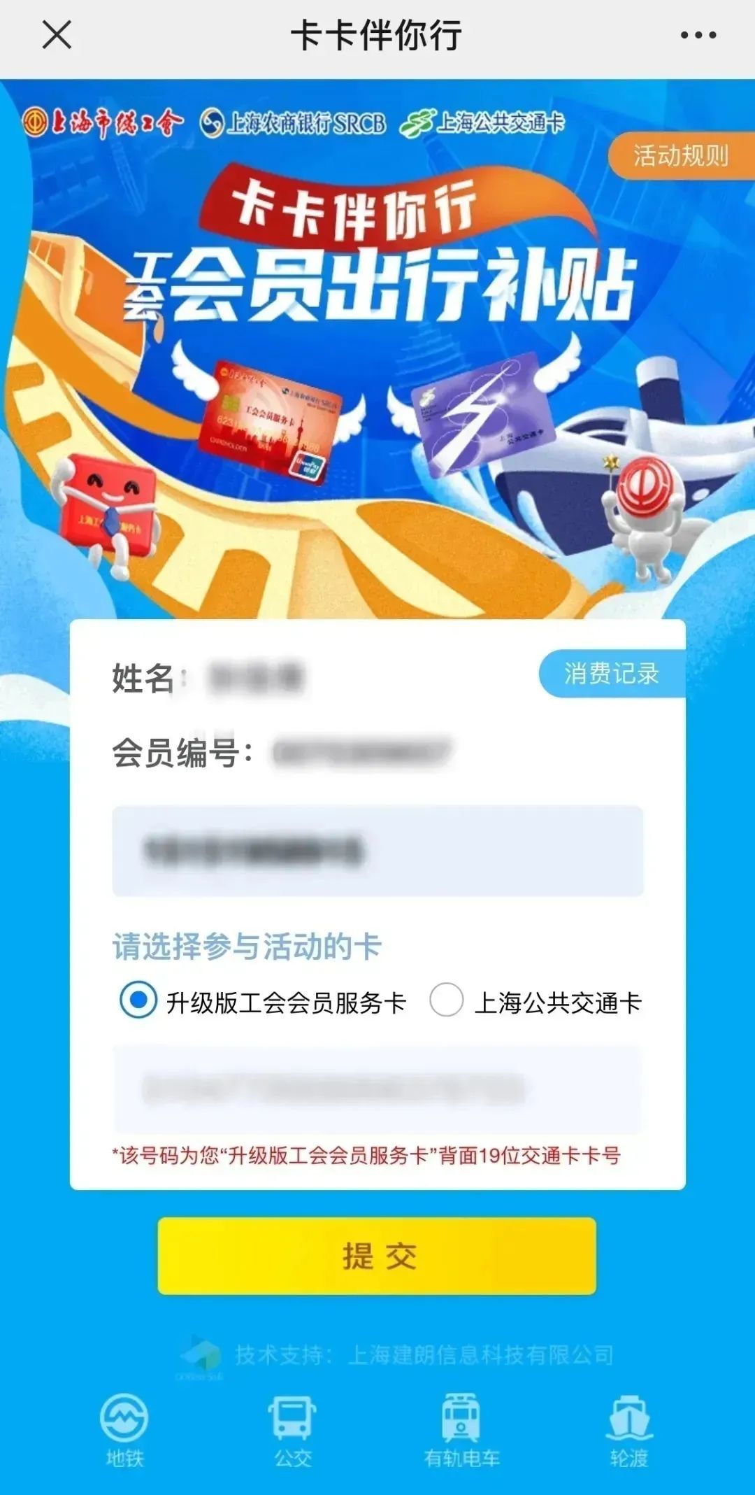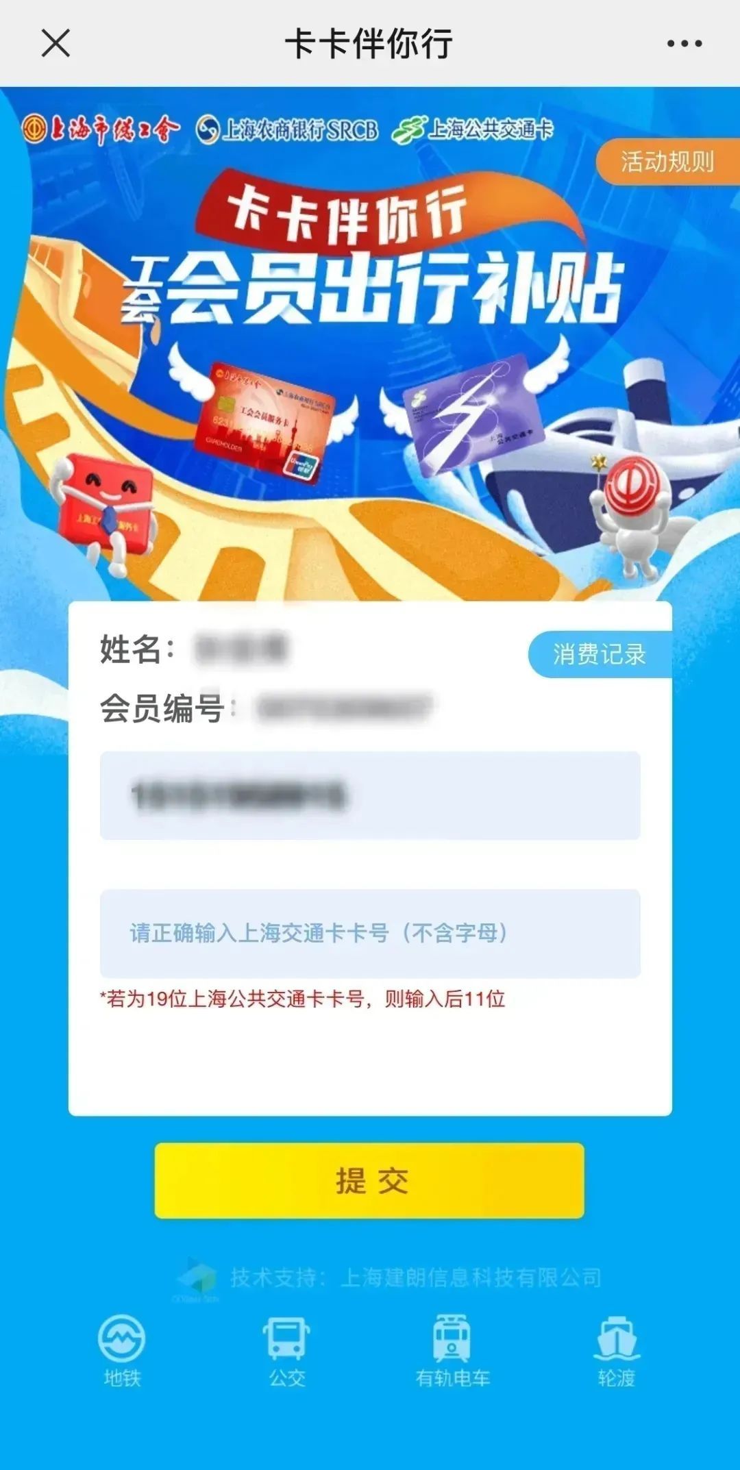 页面自动识别工会会员姓名+会员编号+手机号,需手动输入11位或19位上海公共交通卡卡号(不含开头字母)点击【提交】即可。