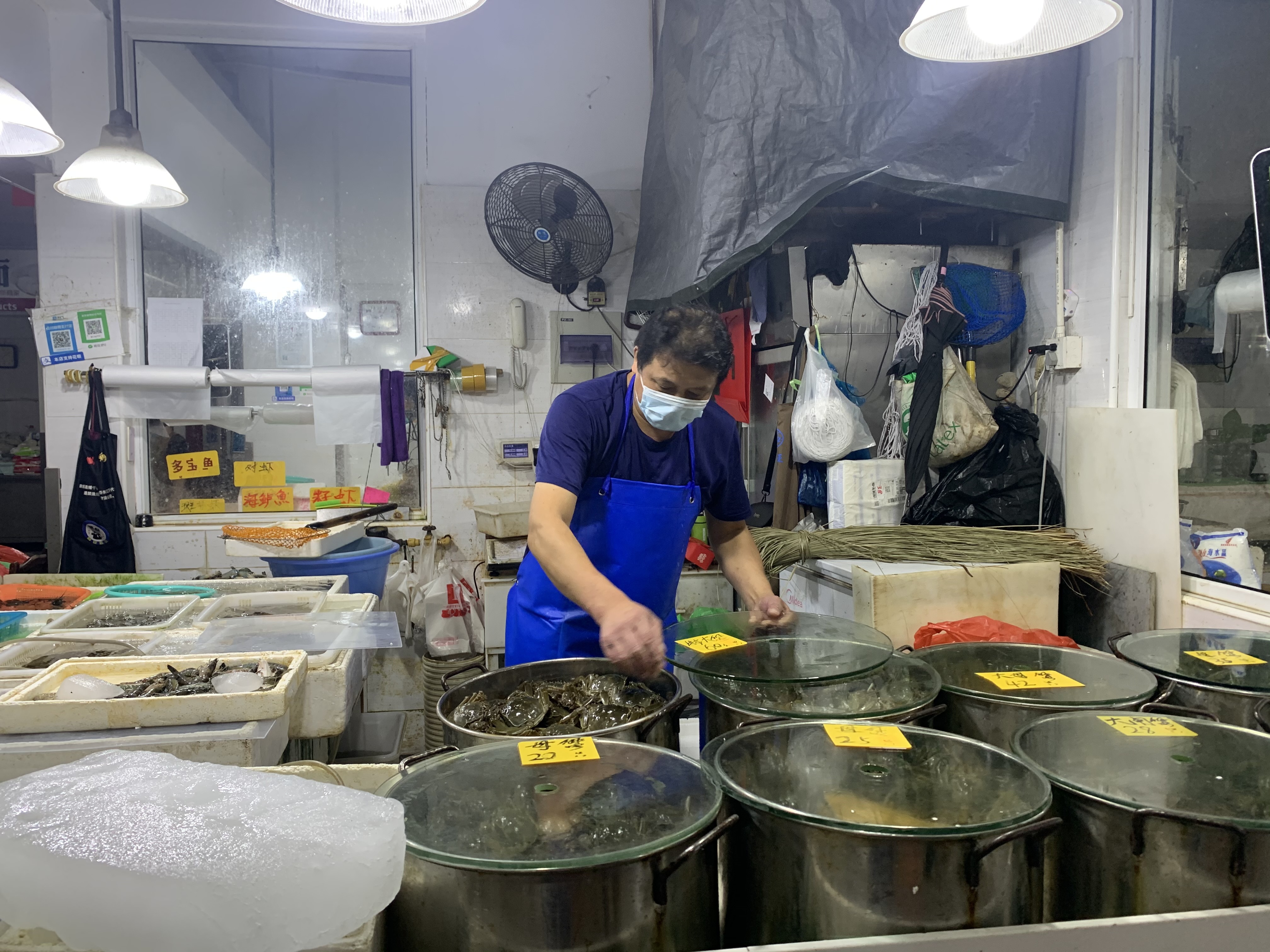 在位于新闸路常德路路口的大闸蟹专卖店,店员正在给大闸蟹装箱,完成一位顾客在外卖平台上点的单。这里主要销售的是昆山地区的大闸蟹。