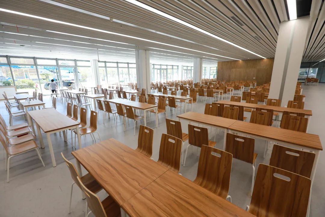 建筑整体设计主打“自然风”,树Y状的白色立柱、绿白相间的墙面、原木色的桌椅,让人有置身于森林之中的清新之感;大面积的透明玻璃窗,让整幢建筑也显得通透明亮。