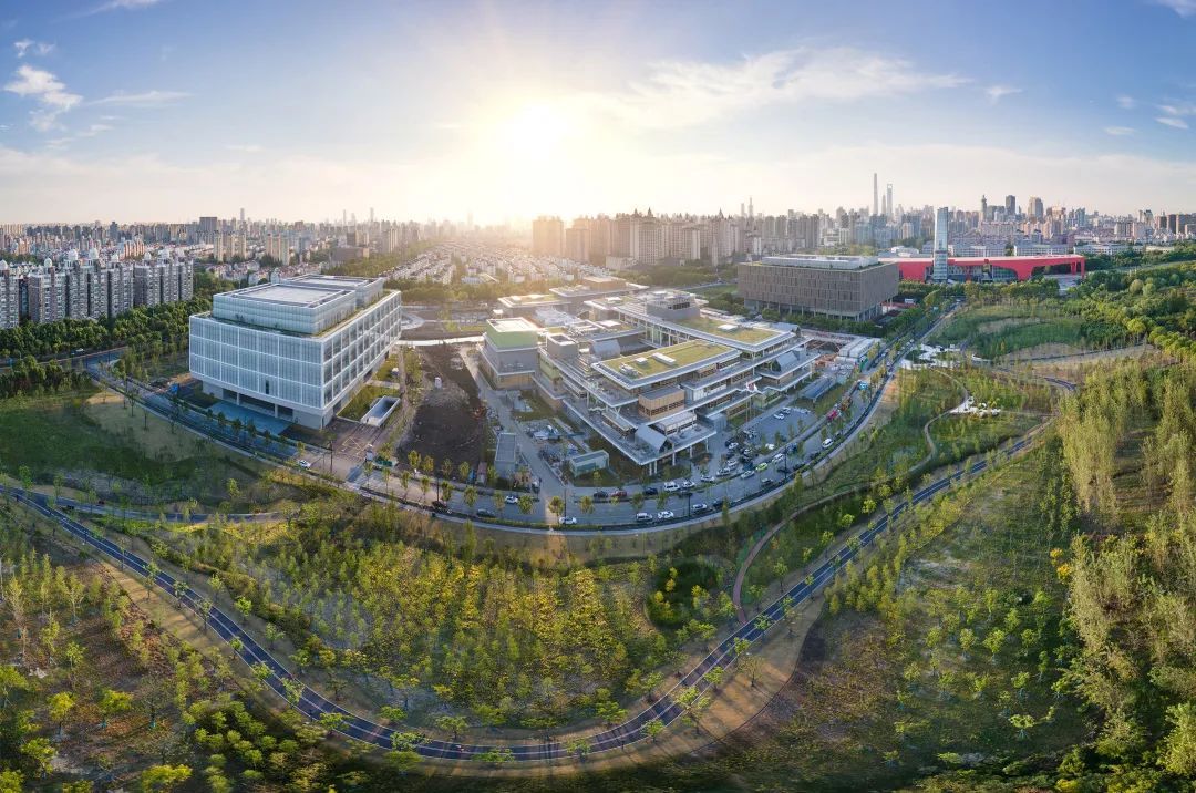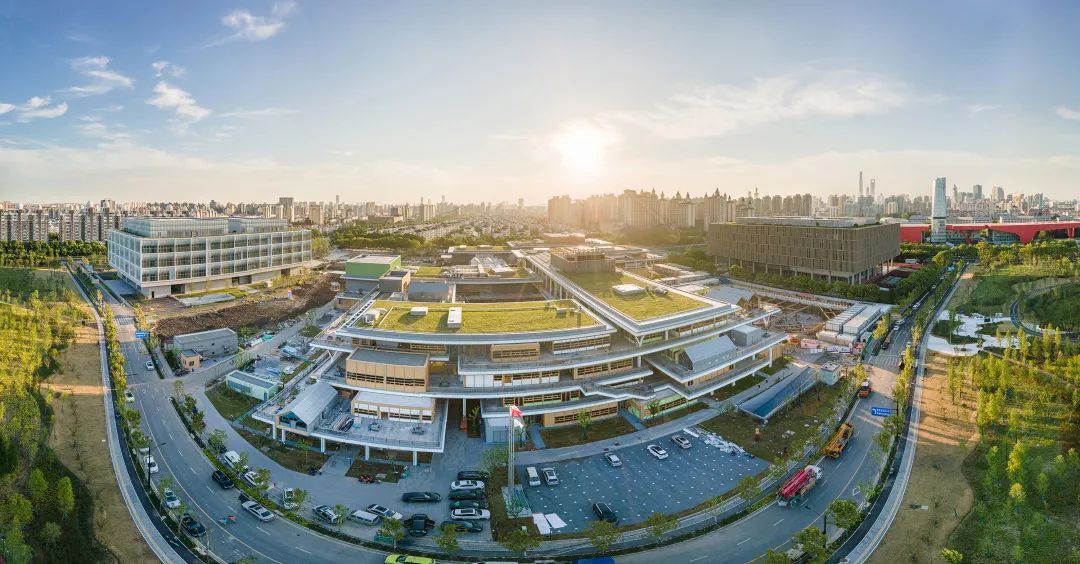 这幢地下一层、地上四层的“回字形”建筑,外观以白色、灰色和浅米色为主打色,完全融入浦东文化公园的自然环境,色调上也与百米外的“大书柜”浦东图书馆相得益彰。身处中庭草坪,A、B、C、D、E这5个区域围成一个回字形,宽阔的风雨连廊将四个区域紧密相连。