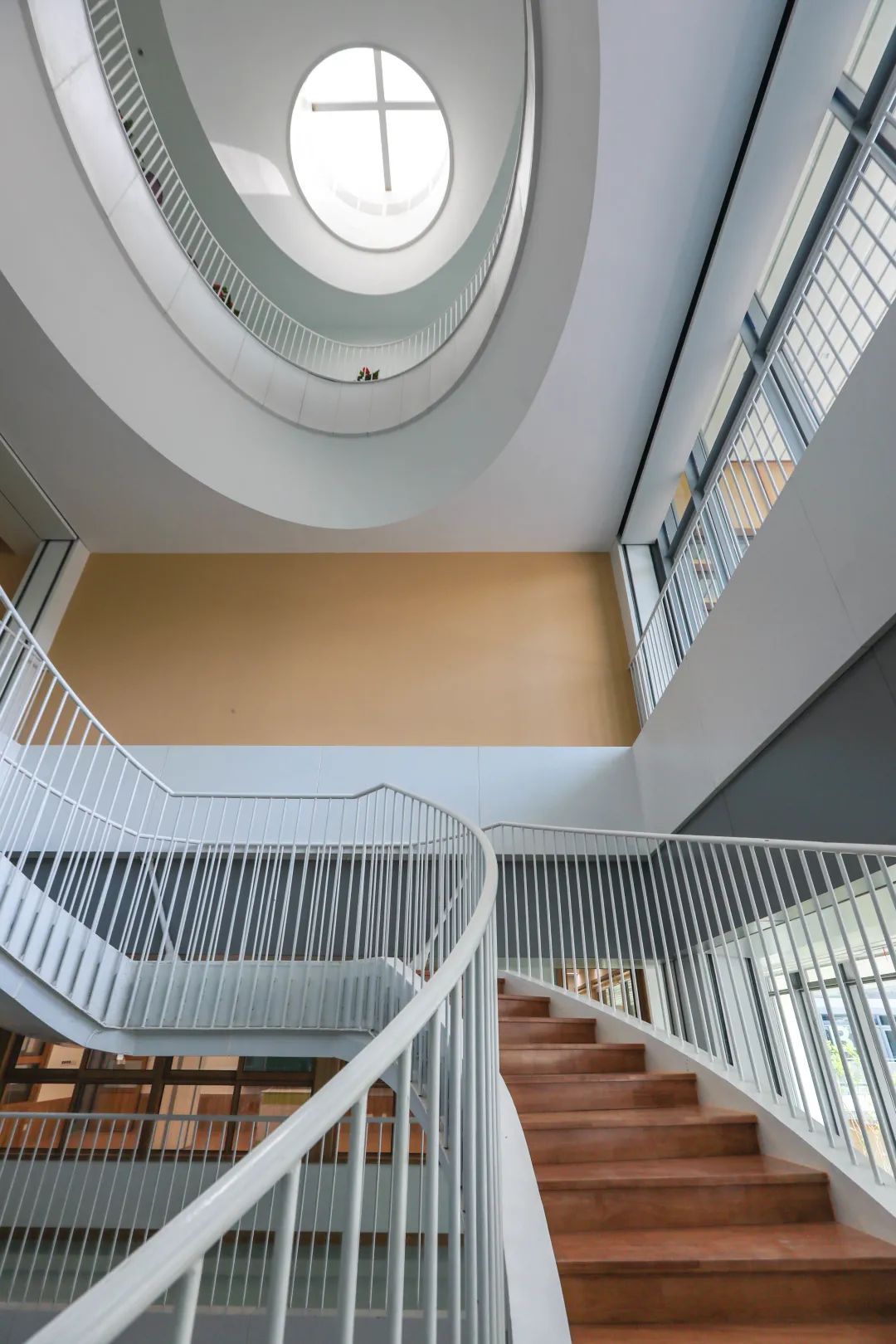 而宽阔的走廊里和转角处,摆放了不少充满艺术感的休息椅,形成了一个个小小的公共空间,不仅为学生课间休息提供了便利,也是小型展演展示的好地方。