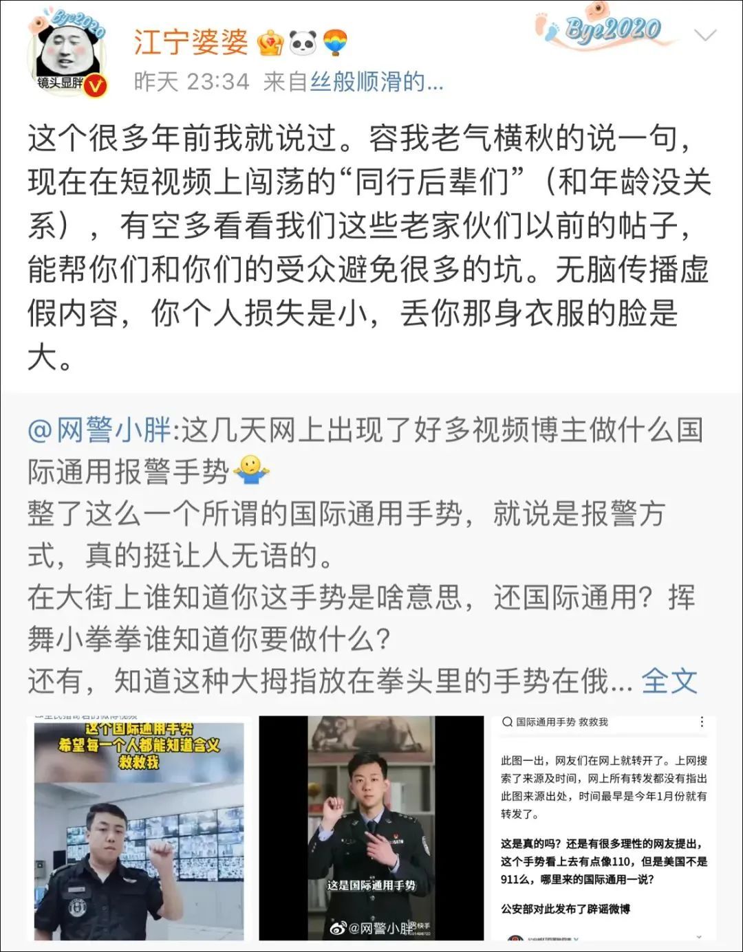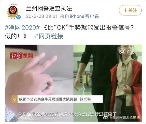 昨天,沈阳网警巡查执法团队负责人微博@网警小胖 转发了相关帖子后无奈表示,“整了这么一个所谓的国际通用手势,就说是报警方式,真的挺让人无语的。普通网民不明就里跟风做这个,我们还可以理解,但是,警方账号也跟风做?是不是有些说不过去了!”