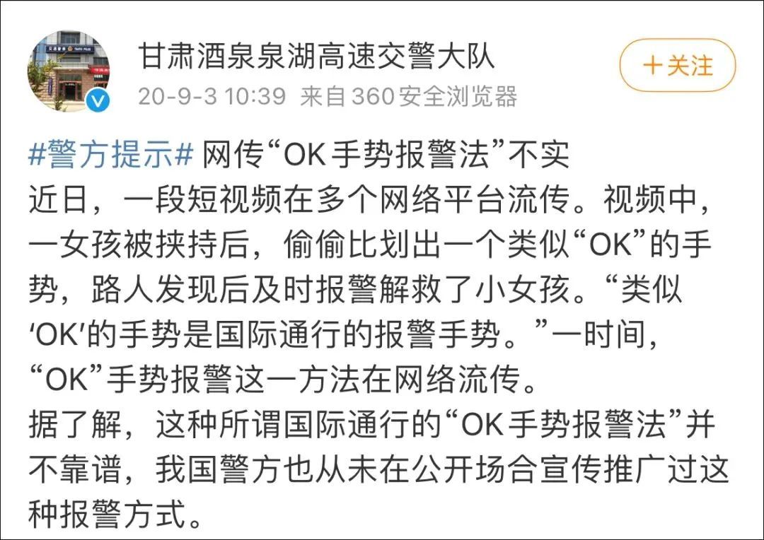 谁能想到,今年,这种谣言换了个“手势”再次在社交媒体上流传……我国警方从未公开推广过这种手势。