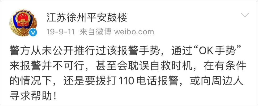 其实,经常逛论坛的网友们应该记得,所谓“国际通用报警求助手势”已经属于陈年老谣言了,2016年,曾流行过一个所谓的“报警”用的“OK手势”,即用大拇指与无名指相触,剩下的三根手指伸直,和一般人比OK的手势略有不同,一些博主号称这是“国际通用报警求助手势”,还拍摄短视频“举例”称,某某又通过这个手势挽救了一条命。