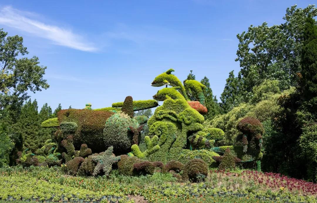 叠翠园中的绿雕从不同的角度体现了新时代中国的民族复兴梦、生态文明梦、花卉强国梦。市民游客可以在园中游览绿意盎然、青山绿水的景象,细品繁荣富强、安居乐业的华彩乐章。