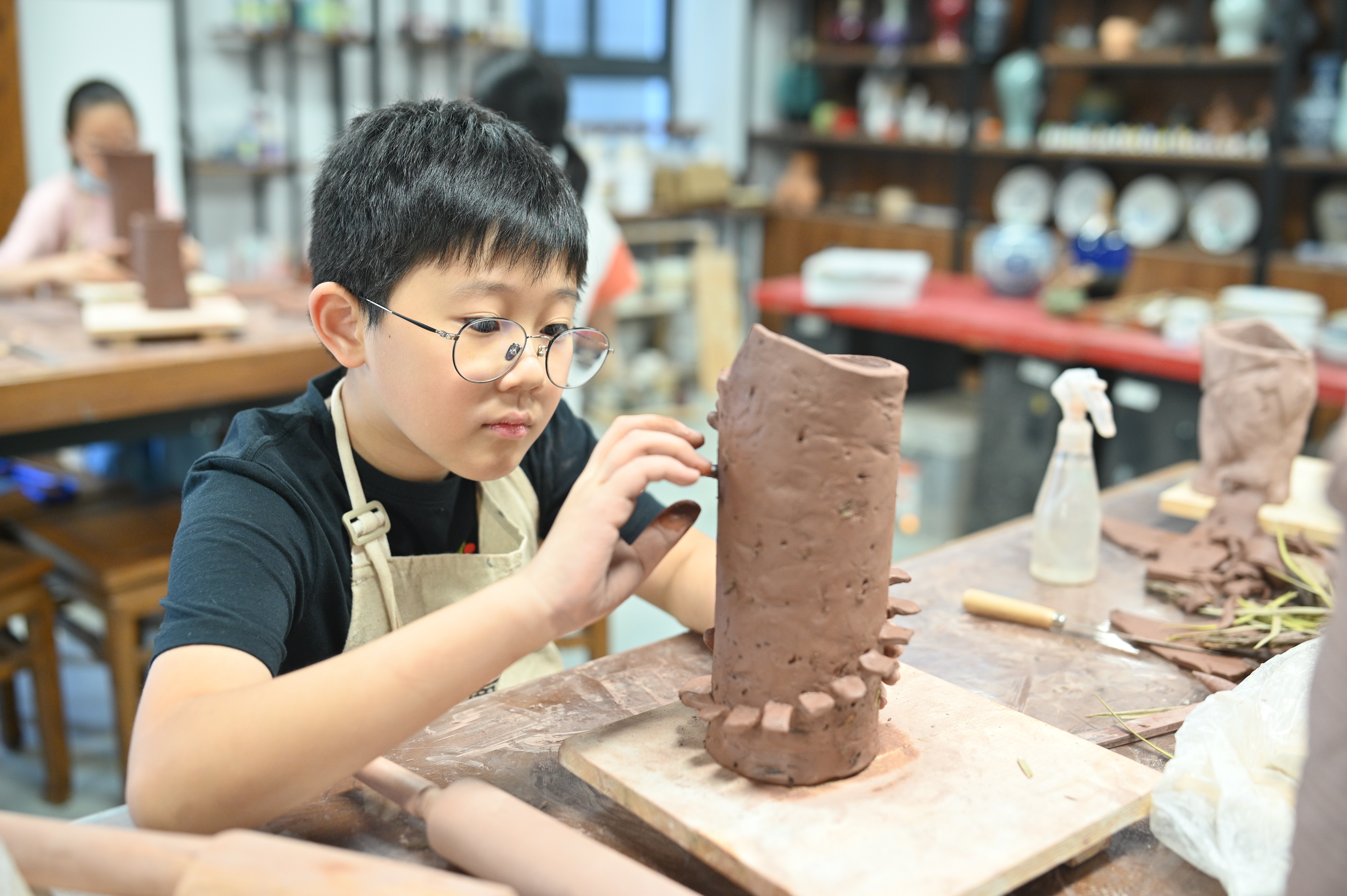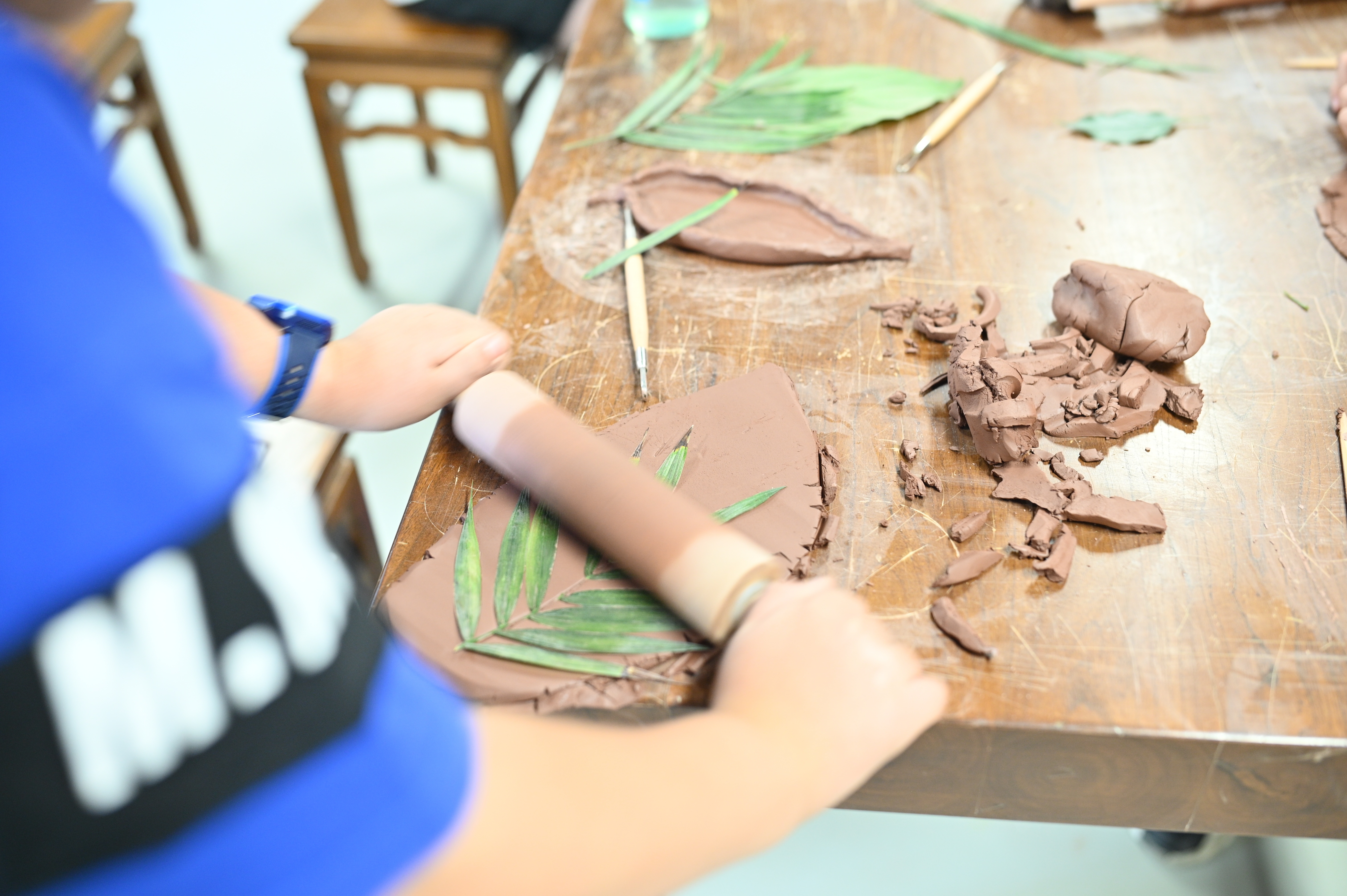 同时,上午的陶艺社团与茶艺社团也如火如荼地开展着。团员们在陶瓷的世界里捏塑着独一无二属于他们自己的树叶纹理盘。一片片树叶在团员手里灵活运用,变成了一个个独特的泥塑盘。