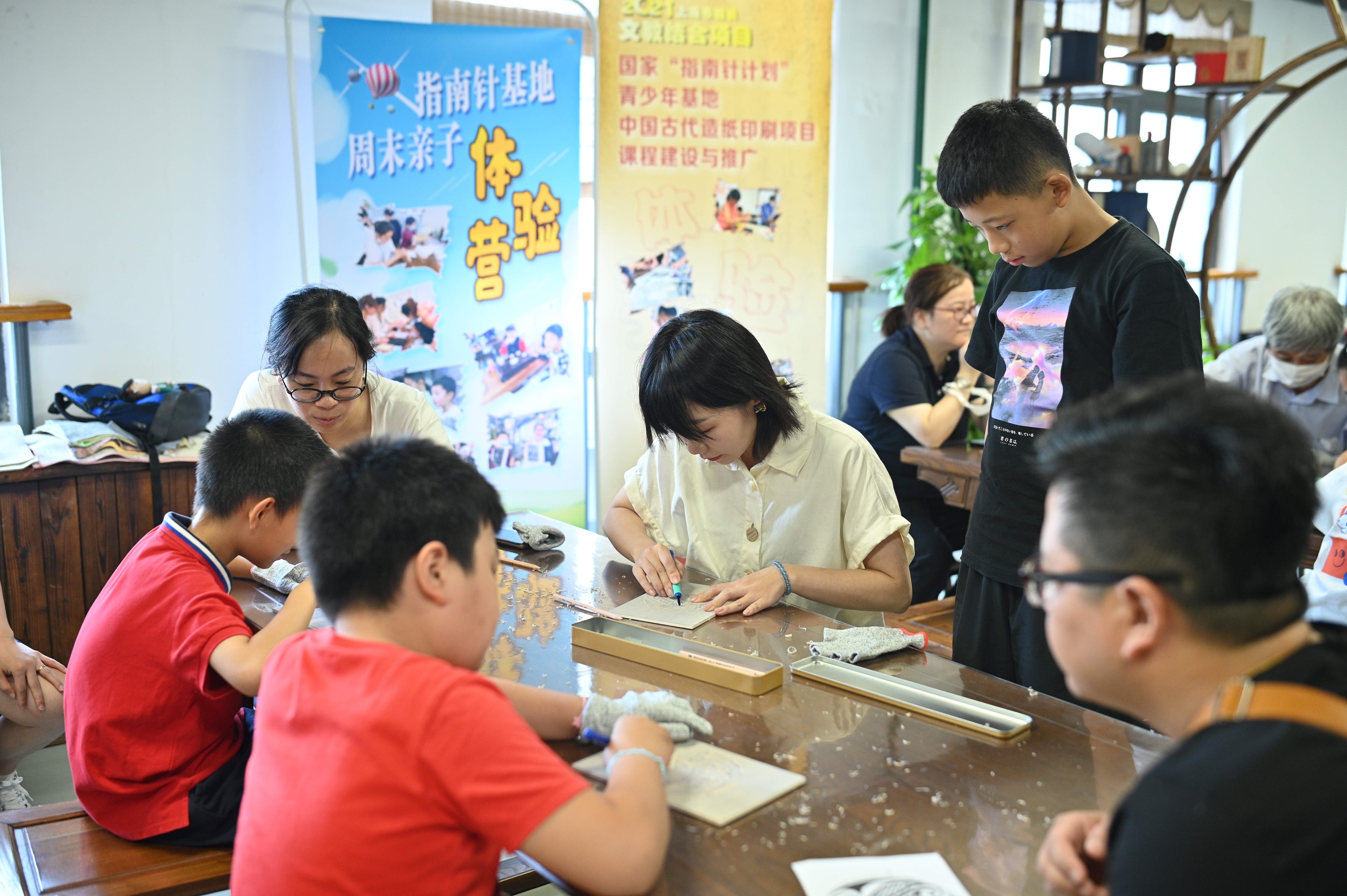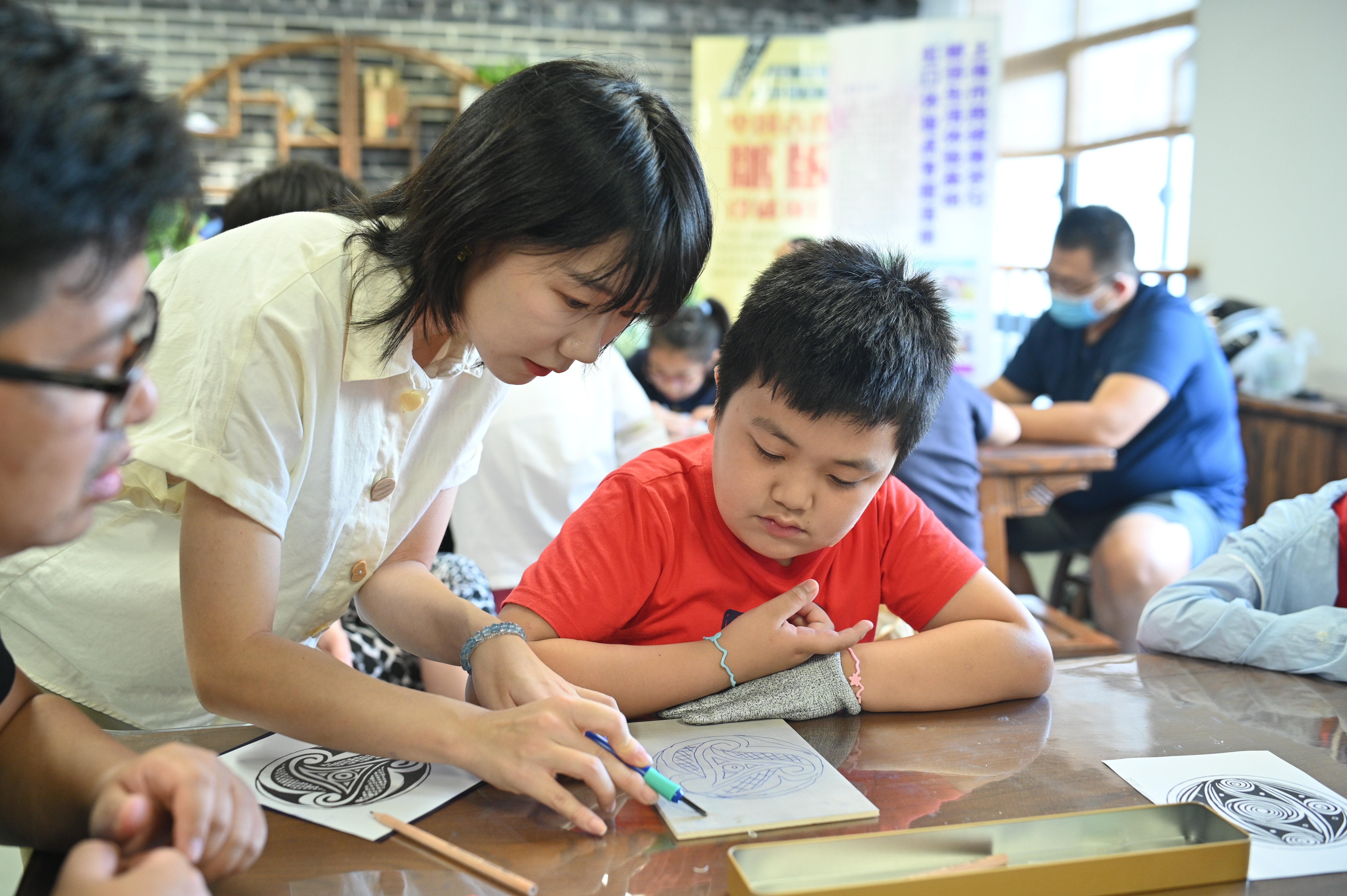 版画教室小朋友与家长热情洋溢,一起绘制完美丽的水波纹,小朋友们又戴上手套,用刻刀在木板上刻下属于他们的艺术理解,完成了一幅精美的雕版印刷作品。