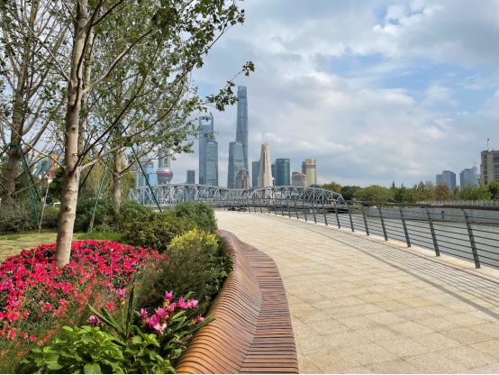 河滨之源观景平台,也是“最上海的观景平台”。这个面积460平方米的观景平台角度特别好,可以让最具代表性的外白渡桥和陆家嘴“四件套”完美同框,晚上还有灯光,非常漂亮。作为漫步最后一站,它别有一番风味和意境,为漫步画上余韵悠长的句号。
