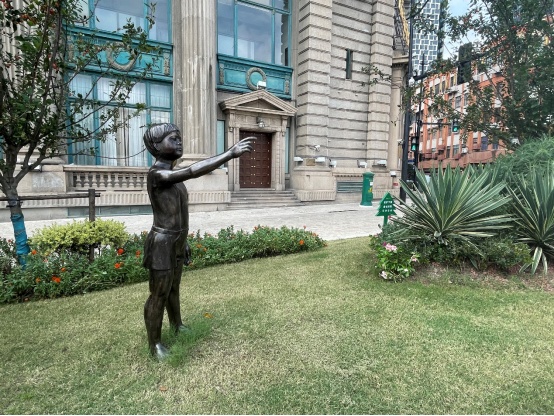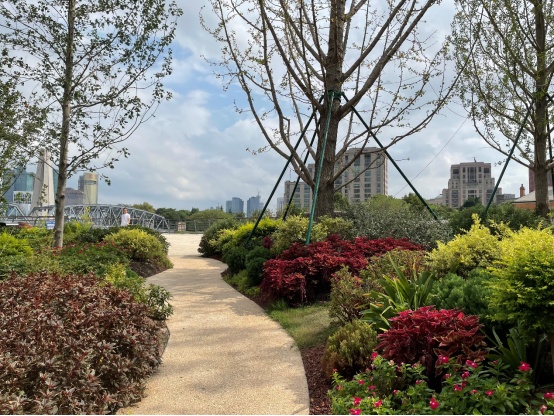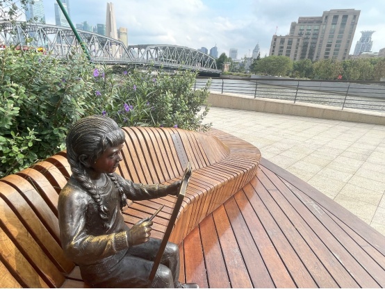 长长的步道两侧鲜花错落有致,轮番绽放,风吹影摇,在阳光下温柔又旖旎。流线型的河畔长椅上,一座既有趣味,又包含着历史文化的雕塑映入小虹眼帘。只见”写生”的女孩细节刻画细腻,无声地述说着上海的历史和故事。静谧又美好的意境、艺术与生态的融合,着实让人忍不住驻足凝望。