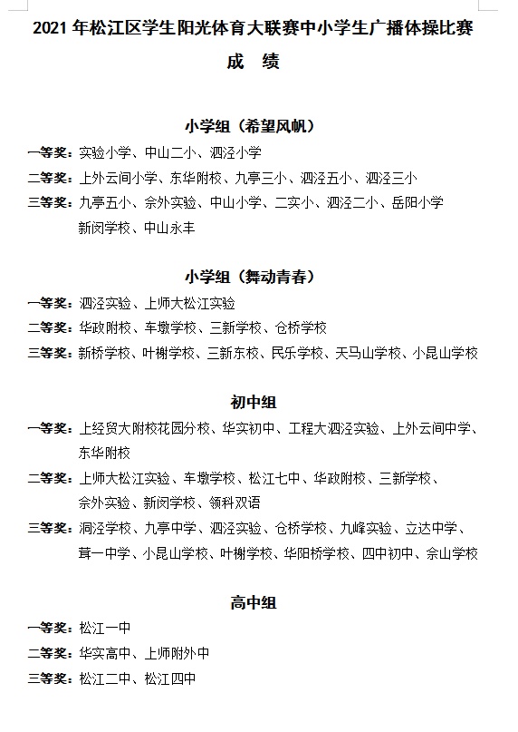 为培养学生竞争、协作精神和集体荣誉感,展示松江学子青春、阳光的精神风貌,进一步推进学校阳光体育活动的蓬勃发展,9月25日,由松江区教育局、松江区体育局主办,松江区青少年活动中心承办的2021年松江区学生阳光体育大联赛中小学生广播体操比赛在东华大学附属实验学校举行。
