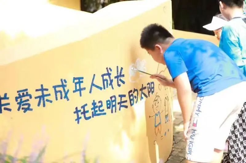 “小先生”们或蹲或坐,或独立完成,或小组合作,很快,墙面上的形象就生动了起来。“关爱未成年人”的墙面上撑起了红色的保护伞,参与“垃圾分类”的小女孩穿起了斑斓的彩裙,“文明养宠”的少女披上了棕红色的长发,所有的色彩就像是“小先生”们生活里一回头就会遇到的亲切邻里。