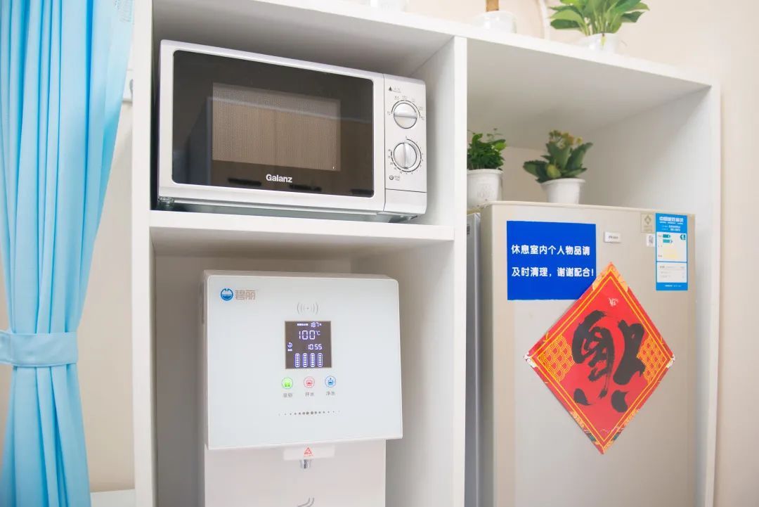 对于临床一线医护人员来说,一个整洁、安静、温馨的休息室就像一个加油站,这里“麻雀虽小,五脏俱全”,可以满足他们日常生活所需,能让他们舒服地吃一顿饭、安静地补上一觉后,再以饱满的热情再度投入工作之中,并将这份能量传递给需要的人。“幸福的生活、高效的工作”是瑞金医院一直倡导和努力的理念。