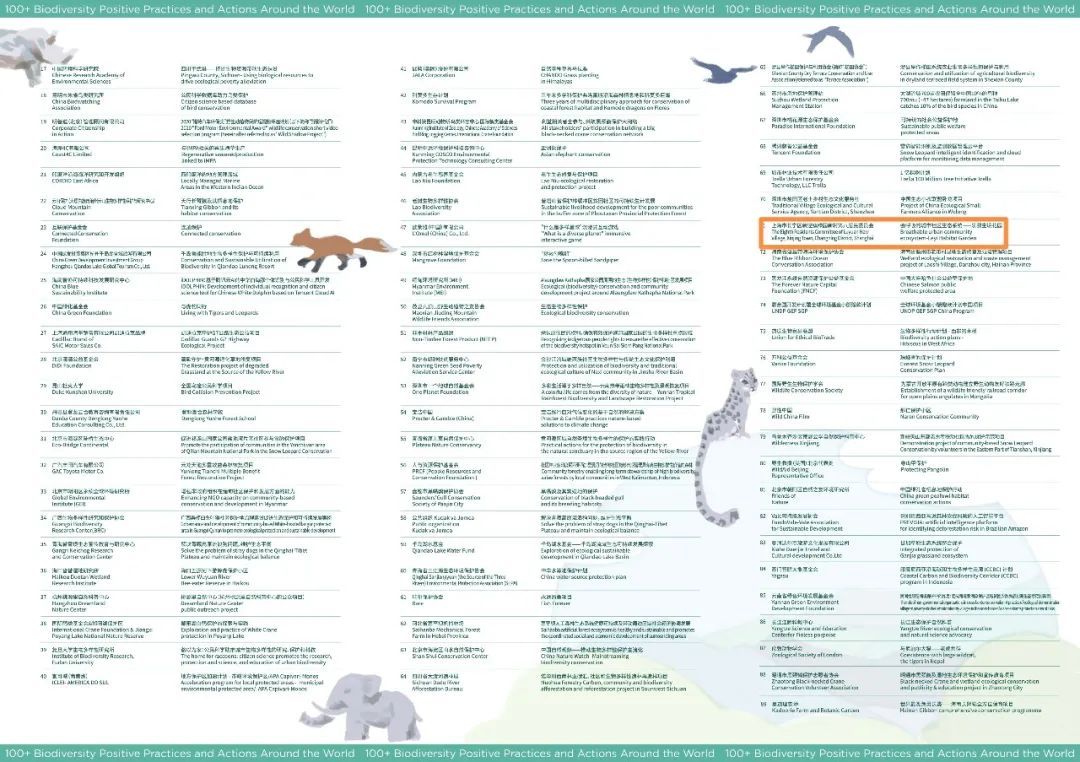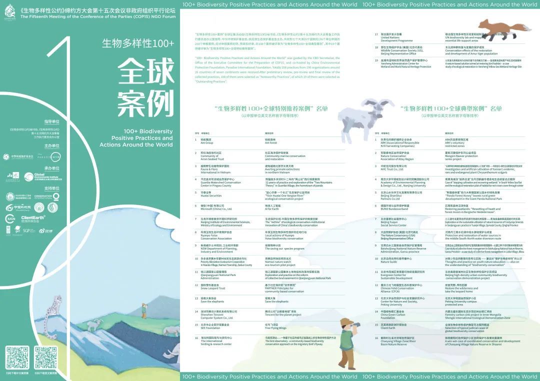 “生物多样性100+案例”全球征集活动是由《生物多样性公约》秘书处、《生物多样性公约》第十五次缔约方大会筹备工作执行委员会办公室指导,中华环境保护基金会、桃花源生态保护基金会主办。经对申报案例初筛、预审和终审,共110个案例被评审为“生物多样性100+全球典型案例”,其中22个案例被评审为“生物多样性100+全球特别推荐案例”。