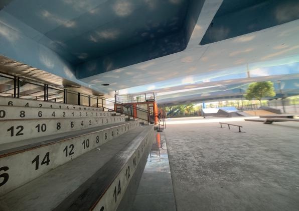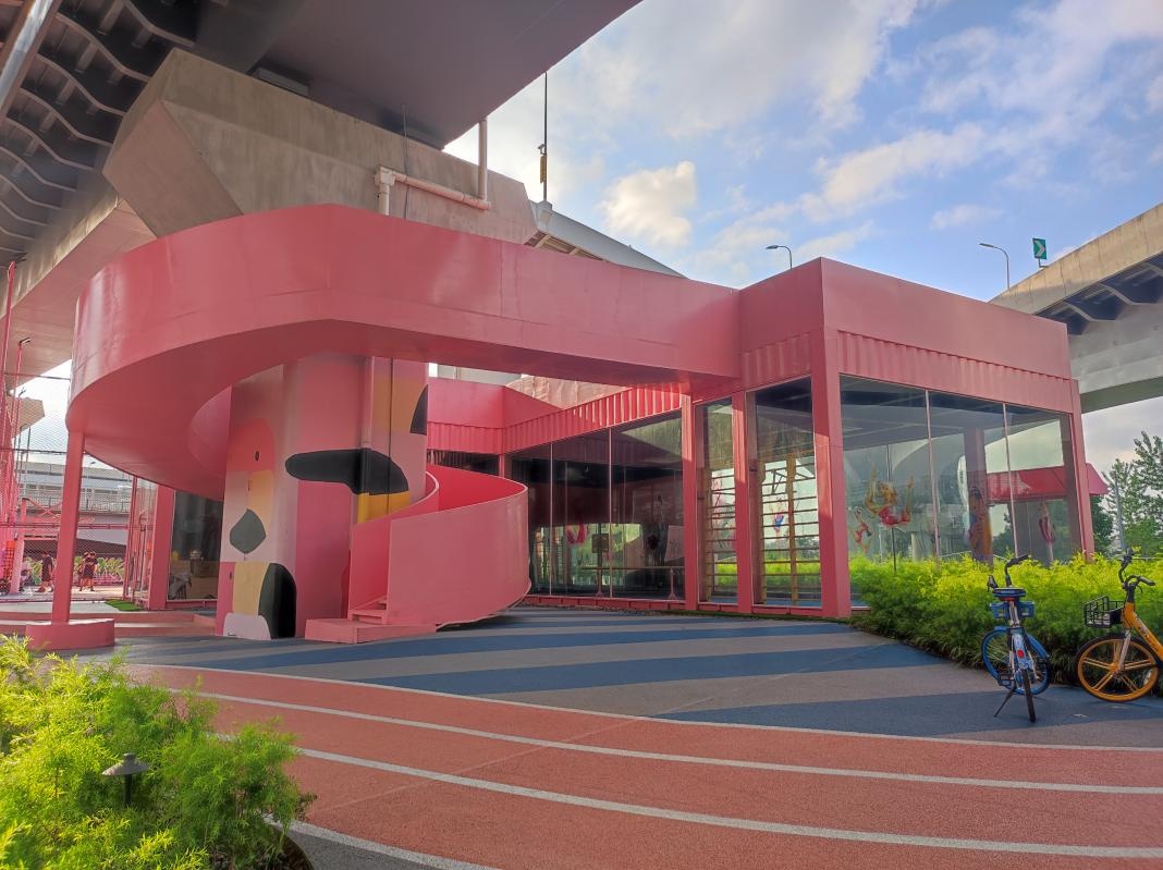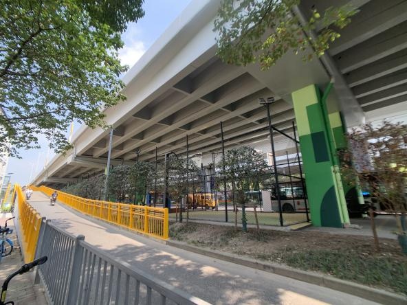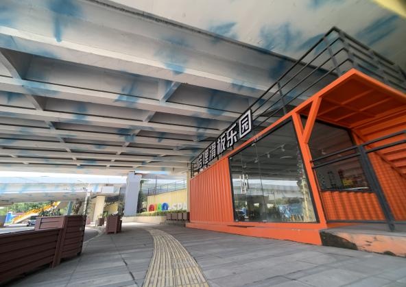 由于濒临蕰藻浜,因此创作者坚持以水岸文化为主题,融入多样的休闲活动空间,篮球场、观光电梯、彩绘楼梯,这里原来是智慧湾科创园的空间延伸段,这让这里的桥下空间“北上海科创体验区”的重要节点的15分钟生活圈的聚焦点和新起点,价值无量。