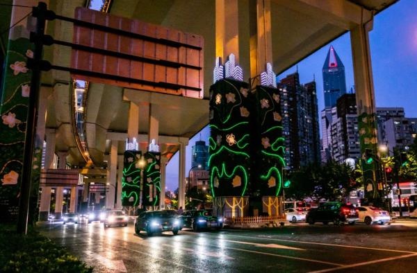 桥柱上是大象迁徙的故事,桥墩上有大象在跳动的画面,宝山区蕰藻浜两岸南北高架桥柱,彩绘和涂鸦,顿时让这些古板硬质的桥柱子加上了文化和文艺的标签。