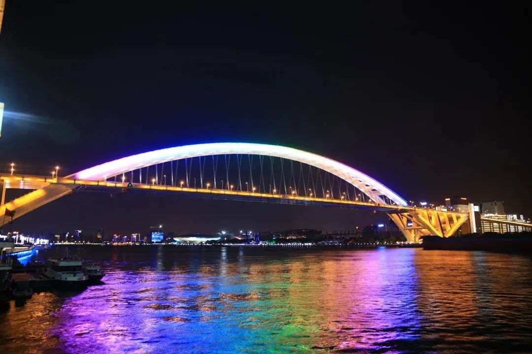 据了解,卢浦大桥主拱上安装彩虹灯形成一挂彩虹越江面的景象,彩虹以往返两岸跑动形式在夜空中划过一道亮丽风景线条;悬索则与整体桥梁形成刚柔并济,桥腹则通过激光投影灯整体打亮,在水中形成五彩斑斓的倒影。