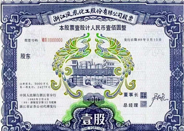 这是一张1989年3月15日发行的浙江凤凰化工有限公司(以下简称“凤凰化工”)股票。