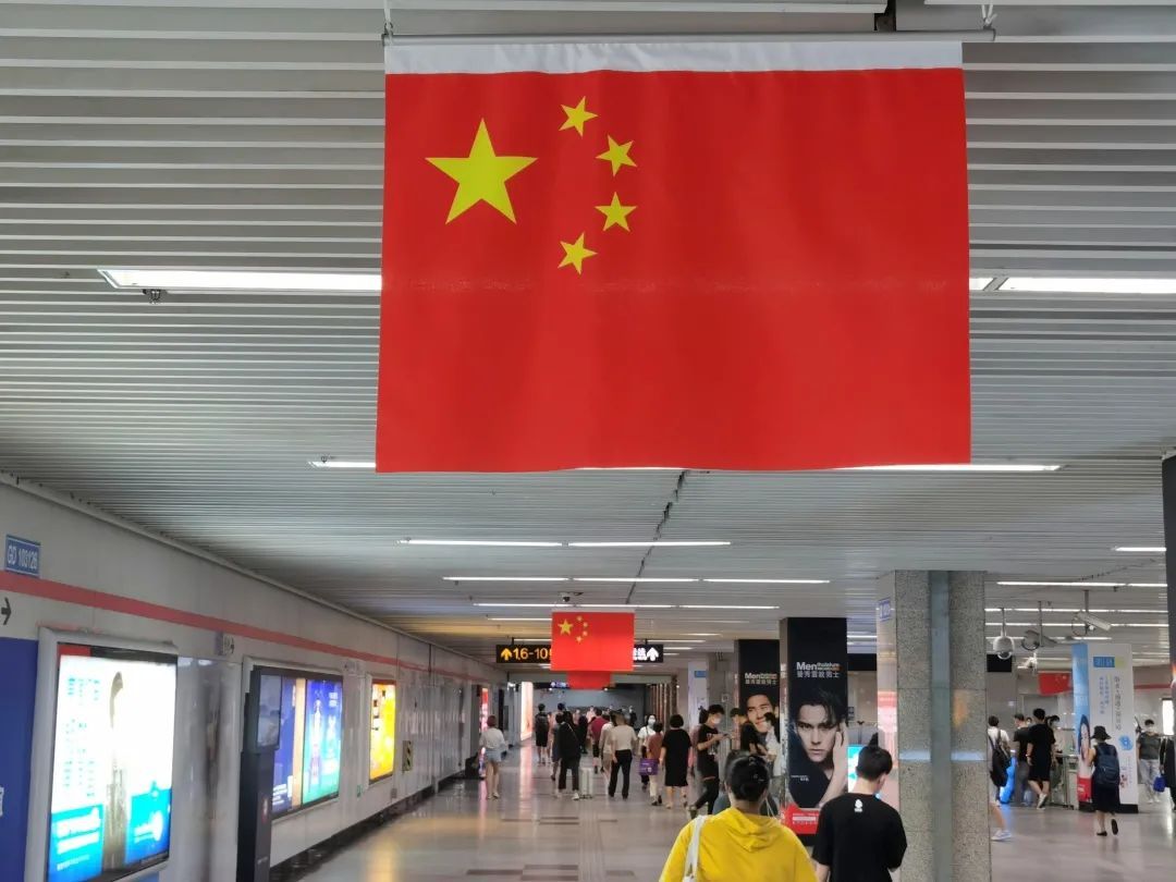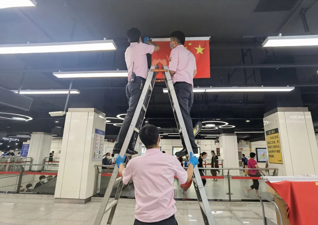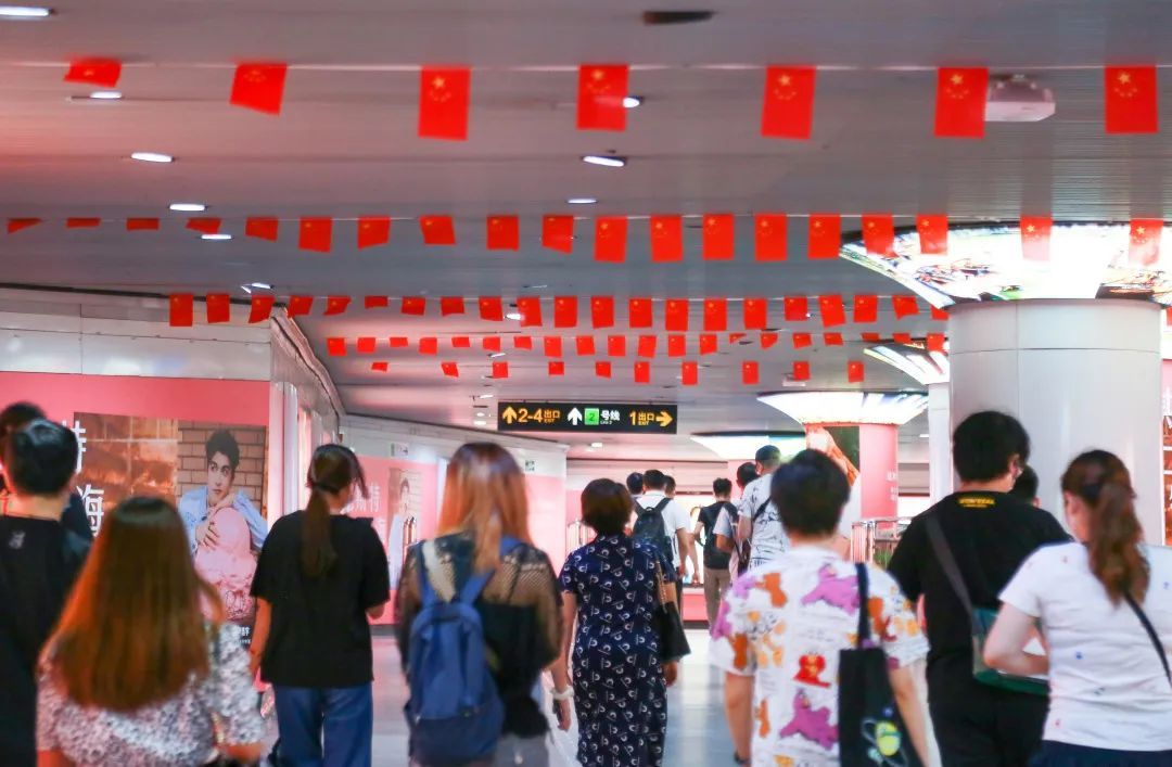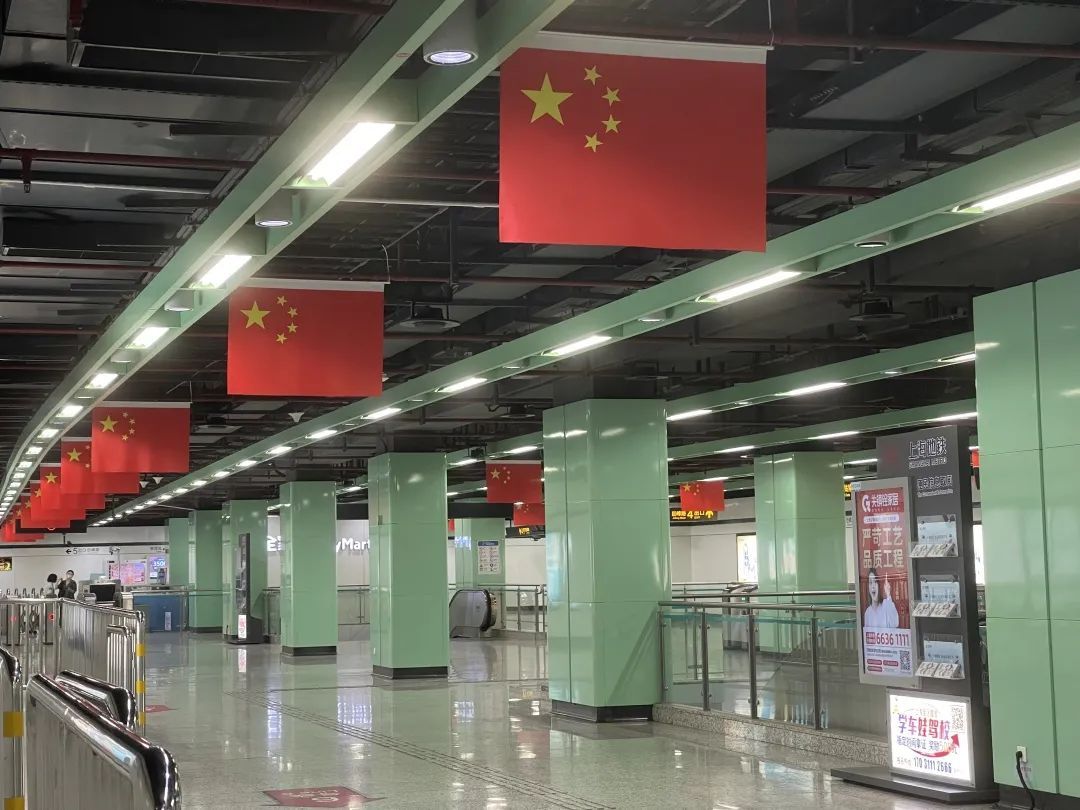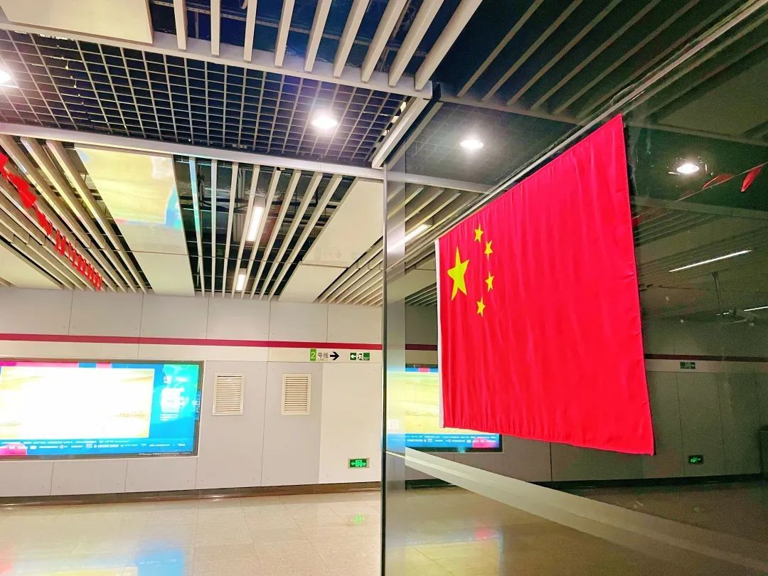 庆祝中华人民共和国成立72周年,上海地铁各车站、换乘大厅、地铁基地、办公楼等都装扮一新,营造出了浓浓的喜庆氛围。在地铁车站中,一面面鲜艳的五星红旗挂起;上海地铁移动电视以及120个车站LED大屏上,将播放宣传2021年国庆宣传主题海报,营造隆重热烈、喜庆祥和的节日气氛。