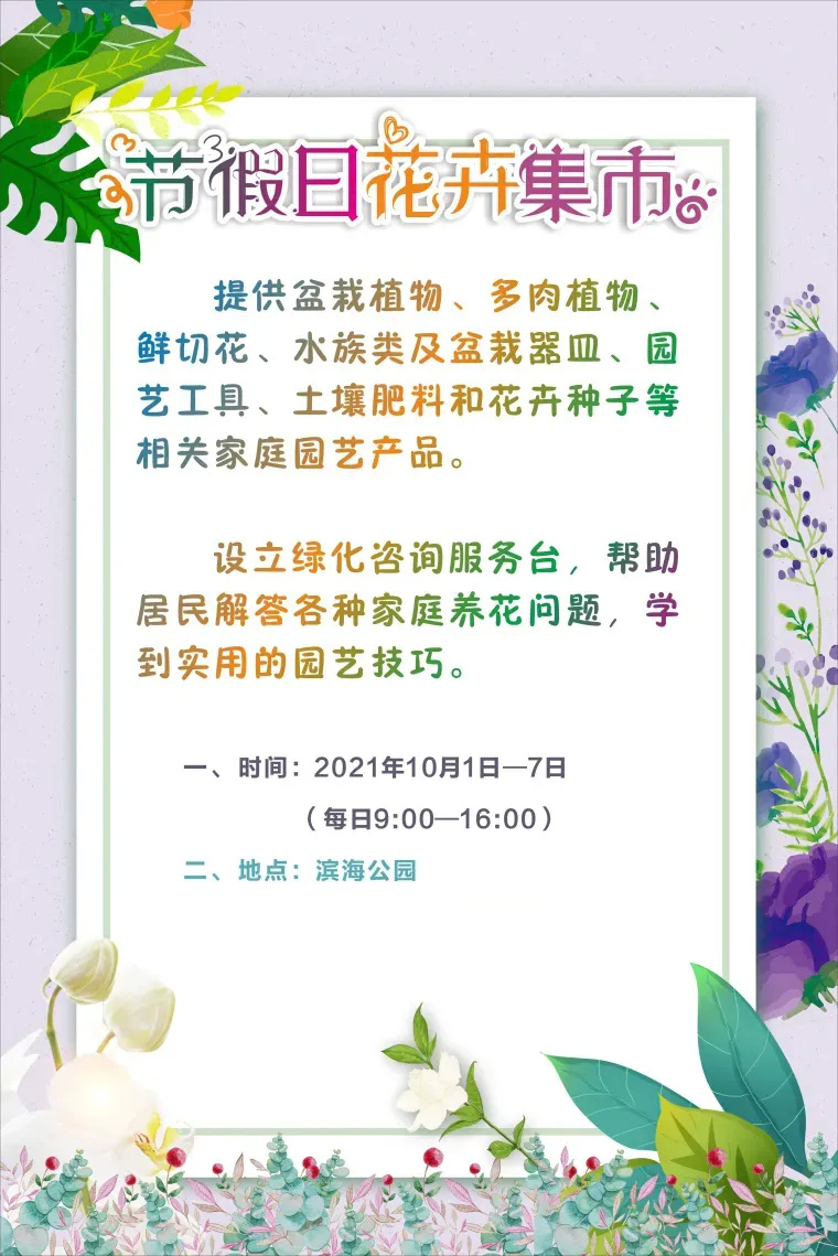 10月1日-7日,金山区第一届公园花市将在滨海公园召开。活动中,区园林所将组织商家提供各色盆栽植物、多肉植物、水族类及盆栽器皿、园艺工具、土壤肥料和花卉种子等相关家庭园艺产品,为市民购花提供便利。同时也会设立绿化咨询服务台,帮助大家解答各种家庭养花困惑。