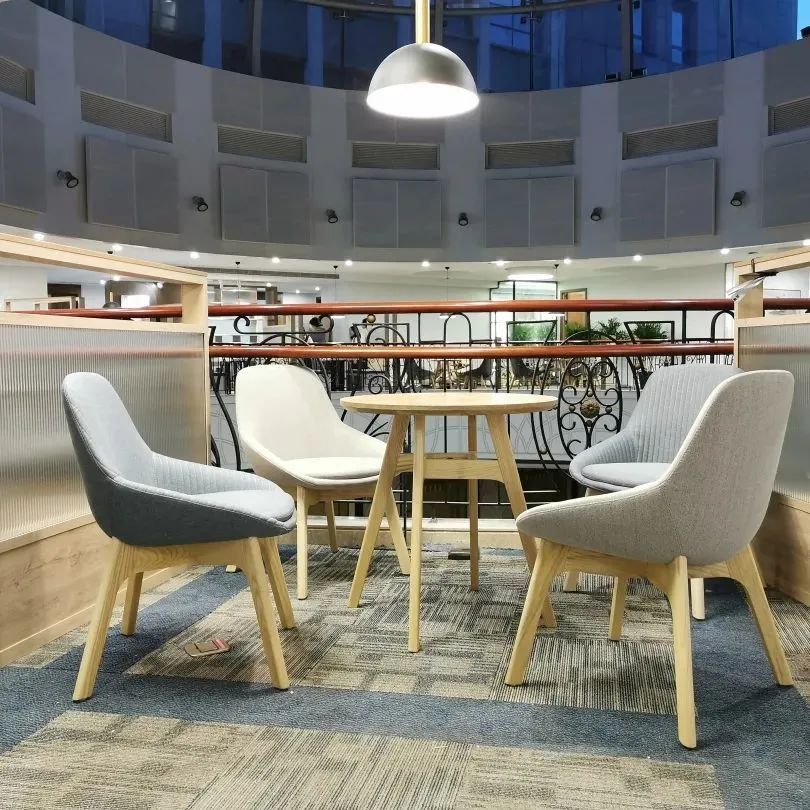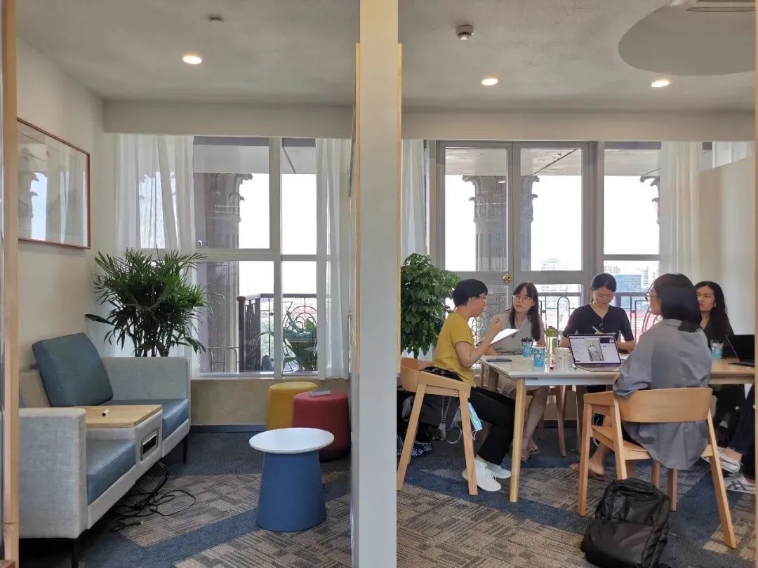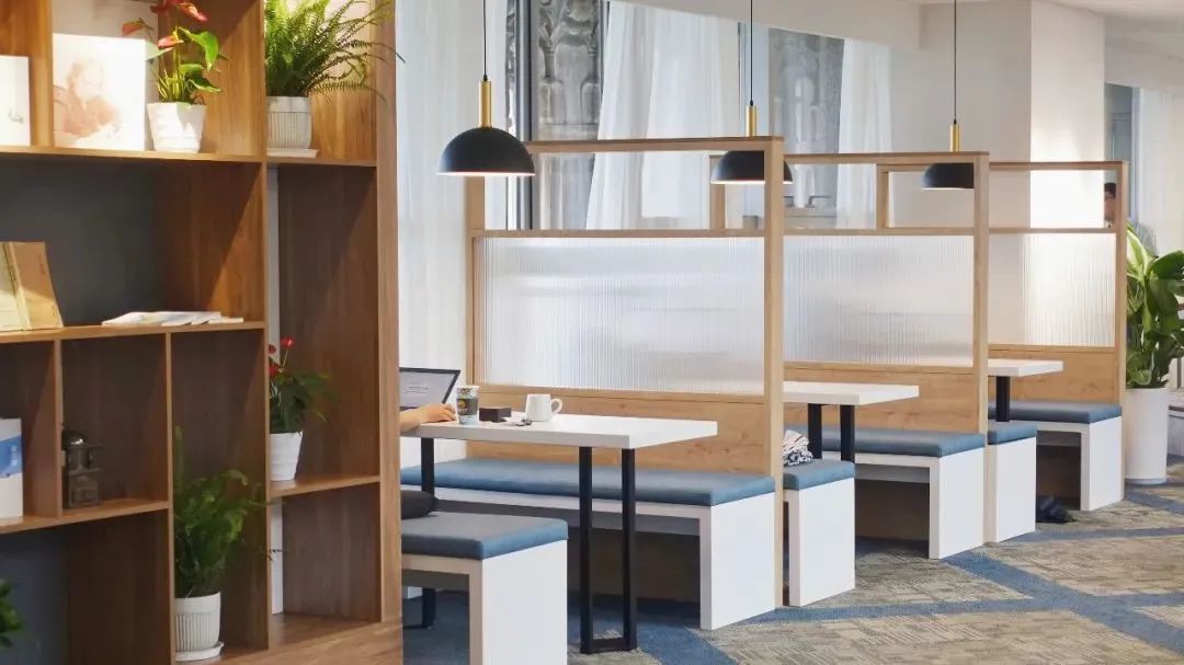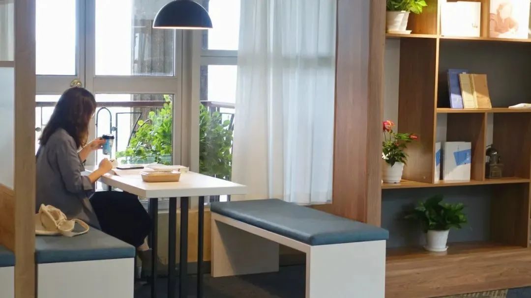 半开放式的讨论室也都各有特色,二人对话、小组讨论都能找到合适的空间,柔和灯光、木制桌椅、清新绿植、电源插座、可手写白板和投影仪,为思维碰撞提供了最舒适灵动的环境。