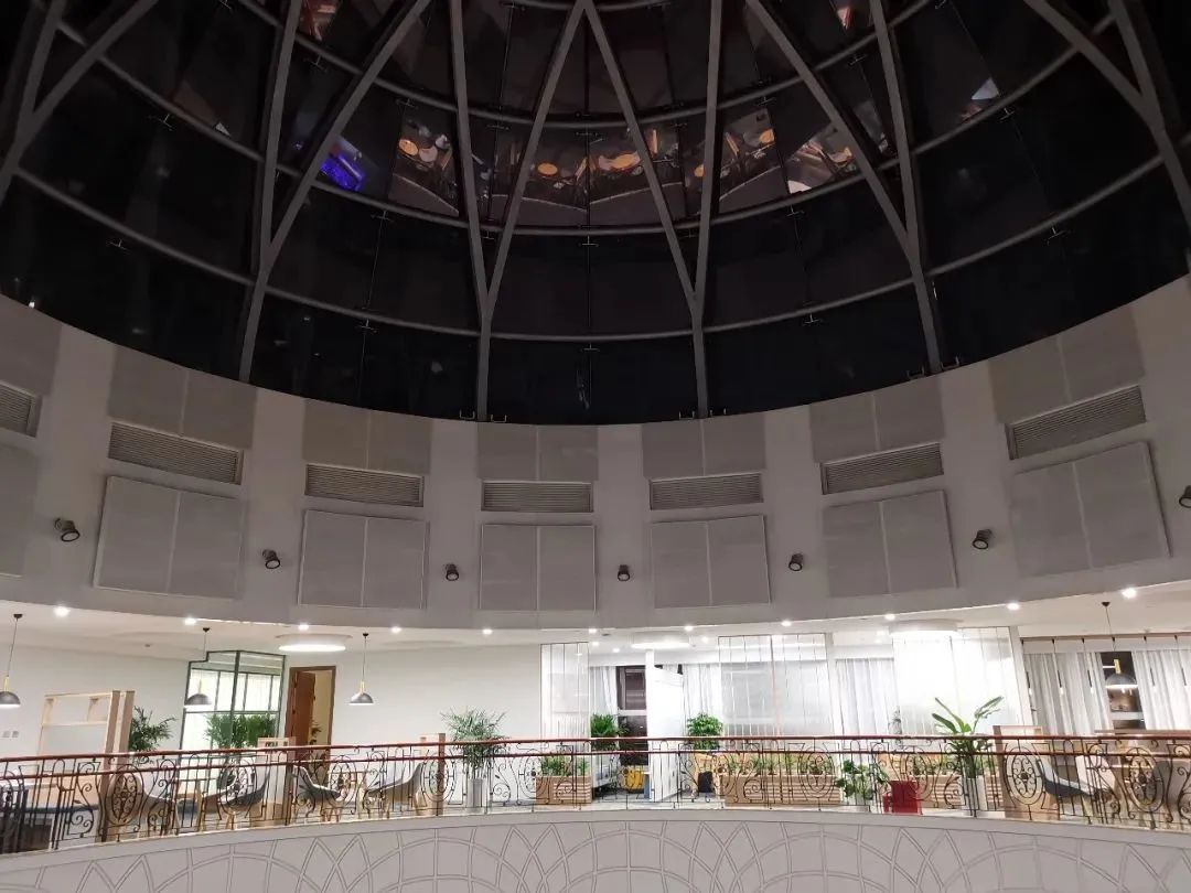 咖吧两侧入门处都有印着复旦校徽的玄关景观墙,从玄关进来开阔明亮的厅内和浩瀚的穹顶一览无余,空间的转折纵深感凸显了咖吧沉稳内敛的气质,玄关墙以绿植、玻璃为隔断,既能遮挡视线又不失自然轻盈感。