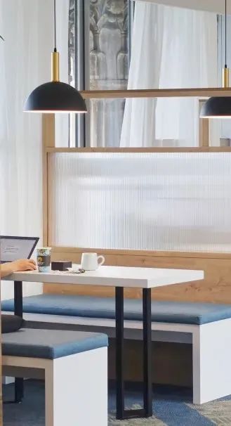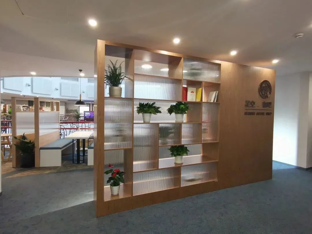 走进咖吧,最醒目的中心区域便是绕圆形围栏铺开的散座区,能够满足多数师生需求,虽然比邻而坐,但由屏风隔开,又形成了一定的私密空间,可以更自在地学习、工作和就餐。