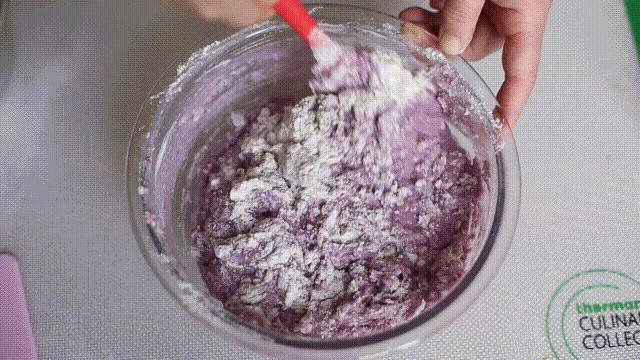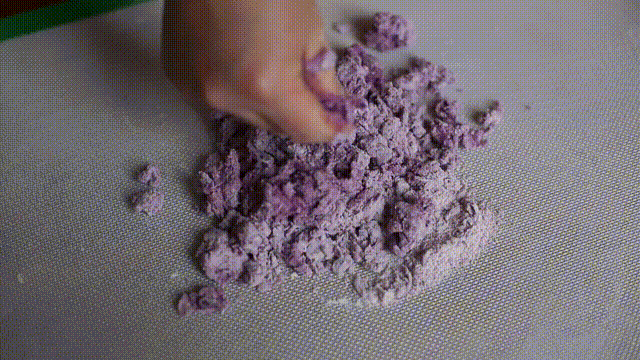 2. 在搅拌后的紫薯泥中,慢慢倒入面粉,再搅拌成絮状后,倒在揉面垫上,揉成光滑面团,密封37°C发酵60分钟。