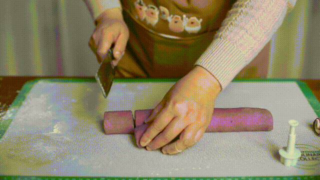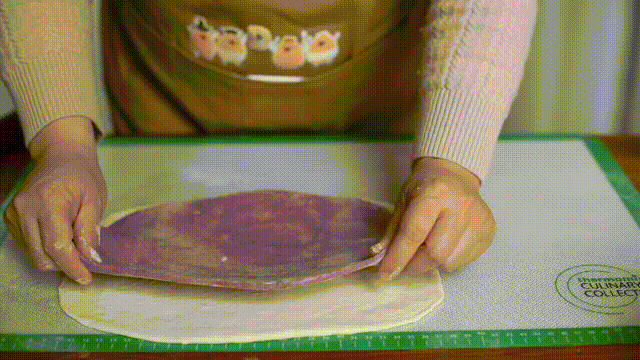 3. 将发酵好的白面团留出20克,紫面团留出10克,将白面团擀成长方形薄片,紫面团擀成和白面团同样大小,白面团光滑的面朝下,刷一层水,把紫面团光滑的面朝上压在白面片上面,擀平、压实、翻面,紫面团在下层,将面团卷起,切3指宽。