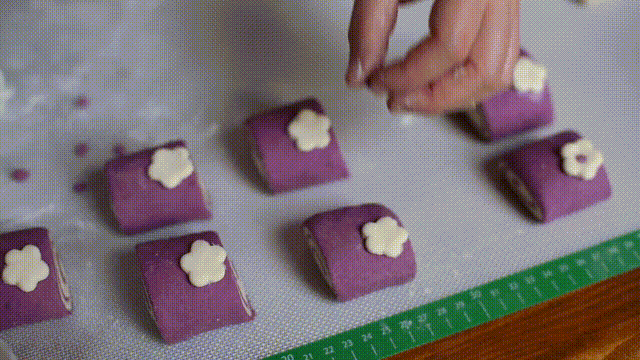 4. 将保留的白面团擀成薄片,用花模压成小花朵,将紫面团揉成小圆球做花心,白色小花刷水粘在馒头表面,将紫色小圆球放在小花中心,用牙签粗的一端穿过花心,固定后,再37°C醒发50分钟。