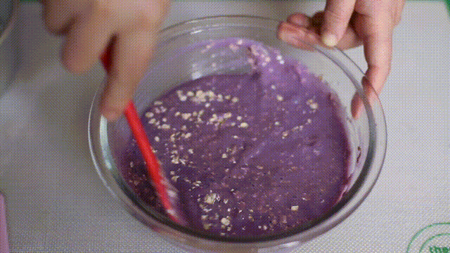 2. 酵母、糖和燕麦再倒入紫薯泥搅拌均匀,后倒入面粉慢慢搅拌至无干粉。