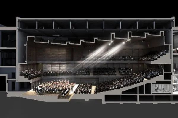 音乐厅观众席一楼放置了倾斜的座位,在一楼和二楼有阳台和环绕的座位,并有电梯可以到一楼。