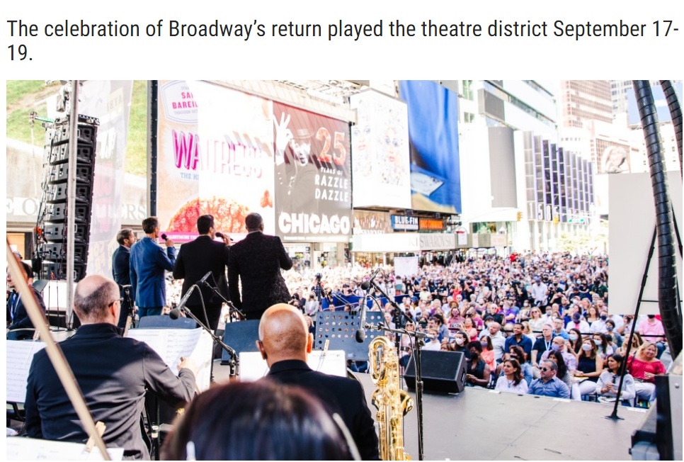 9月17日-19日,为纪念疫情关闭后百老汇的回归,为期三天的免费户外戏剧节——“大幕开启!”(Curtain Up!)在纽约时代广场举行。