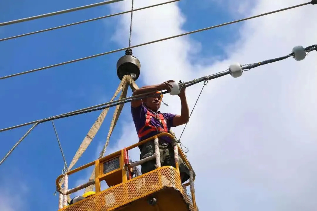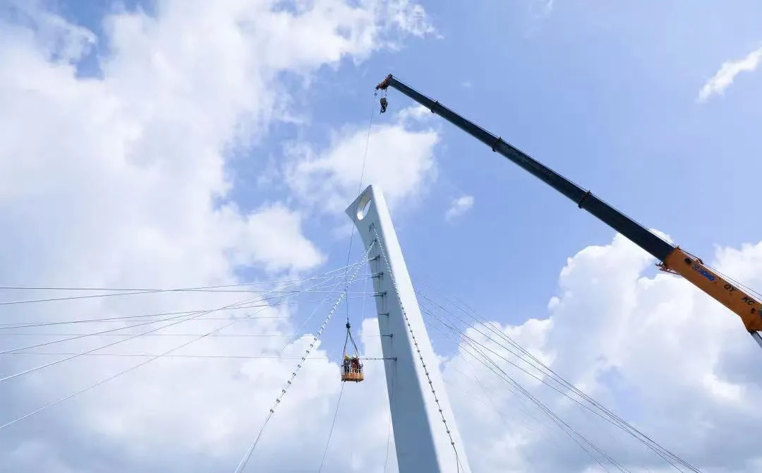 但是,“点亮”白牛塘桥的背后是不为人知的辛苦与艰难。白牛塘桥是双索面斜拉桥,主塔高29米。工程启动之初,正是最炎热的三伏天,工人们不仅需要戴上安全帽、系上防高空坠落安全带,在大型机械臂的帮助下,如“蜘蛛人”般依次在26根钢索上,安装2000多个球形灯具,难度可想而知。