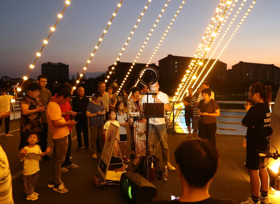 萨克斯仿佛成了群众文化的“引爆点”。慢慢地,越来越多的金山文艺爱好者在白牛塘桥上争相“竞技”。从9月中旬开始,在网红桥上,金山本土拥有5万多粉丝的网红开启了唱歌直播,白牛塘美丽的夜景在其直播间进行了完美呈现;在桥另一边,舞蹈爱好者们,将异域风情的新疆舞跳得引来周边群众的阵阵掌声。“特别的精彩,我们也乐在其中。”周边居民对这些表演,看在眼里,喜在心里。