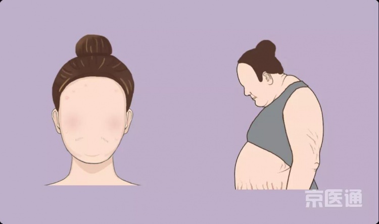 症状特点:脸圆似满月,双下巴明显,皮肤发红,伴有痤疮和小胡须。