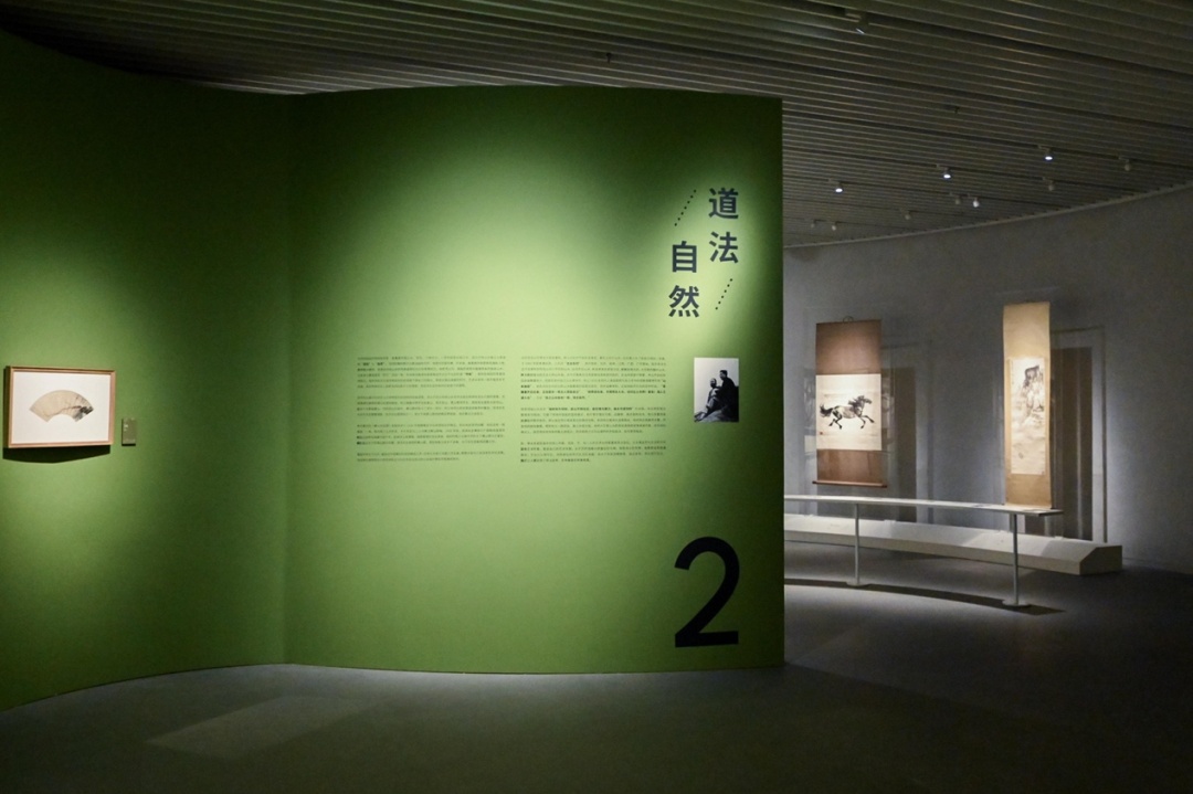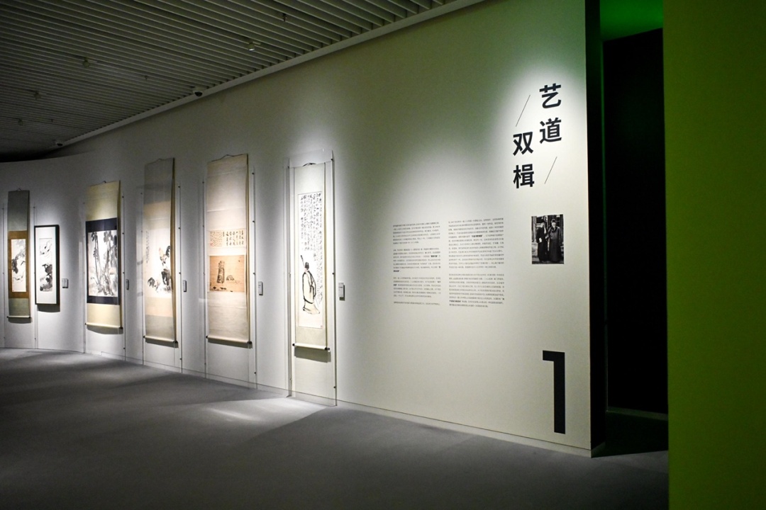 齐白石评价徐悲鸿,认为他胸中有风景,故能绘真山真水。徐悲鸿认为齐白石的艺术达到了“致广大,尽精微”的高度,胸中具备万物。徐悲鸿对张大千也是推崇备至,认为他的山水画成就集晋唐宋元之大成。在这一部分,分别展有齐白石和徐悲鸿画的《持扇钟馗》。这两幅作品虽然主题相同,但在形象的构思上却都别出心裁。徐悲鸿画的钟馗背影魁伟,孤傲脱俗,折扇上题写的“分明画来寻开心”幽默尽显。齐白石描绘的钟馗着大红袍,饰蓝腰带,面容轻松,非常诙谐。